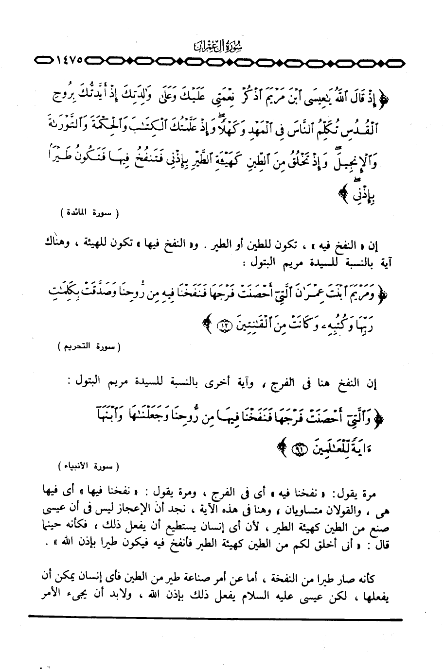 إن» النفخ فيه «، تكون للطين أو الطير. و» النفخ فيها «تكون للهيئة، وهناك آية بالنسبة للسيدة مريم البتول: {وَمَرْيَمَ ابنت عِمْرَانَ التي أَحْصَنَتْ فَرْجَهَا فَنَفَخْنَا فِيهِ مِن رُّوحِنَا وَصَدَّقَتْ بِكَلِمَاتِ رَبِّهَا وَكُتُبِهِ وَكَانَتْ مِنَ القانتين} [التحريم: 12] .