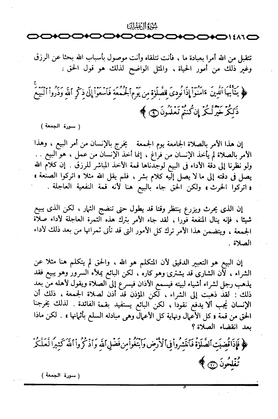 إن هذا الأمر بالصلاة الجامعة يوم الجمعة يخرج بالإنسان من أمر البيع، وهذا الأمر بالصلاة لم يأخذ الإنسان من فراغ، إنما أخذ الإنسان من عمل، هو البيع.