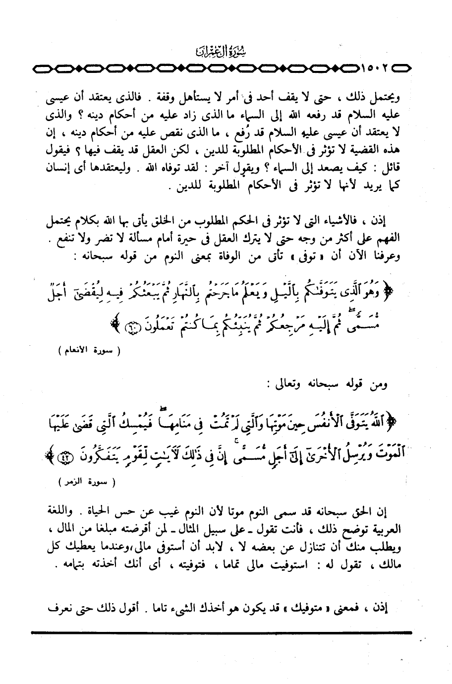 إذن، فالأشياء التي لا تؤثر في الحكم المطلوب من الخلق يأتي بها الله بكلام يحتمل الفهم على أكثر من وجه حتى لا يترك العقل في حيرة أمام مسألة لا تضر ولا تنفع. وعرفنا الآن أن «توفى» تأتي من الوفاة بمعنى النوم من قوله سبحانه: {وَهُوَ الذي يَتَوَفَّاكُم بالليل وَيَعْلَمُ مَا جَرَحْتُم بالنهار ثُمَّ يَبْعَثُكُمْ فِيهِ ليقضى أَجَلٌ مُّسَمًّى ثُمَّ إِلَيْهِ مَرْجِعُكُمْ ثُمَّ يُنَبِّئُكُم بِمَا كُنتُمْ تَعْمَلُونَ} [الأنعام: 60] .