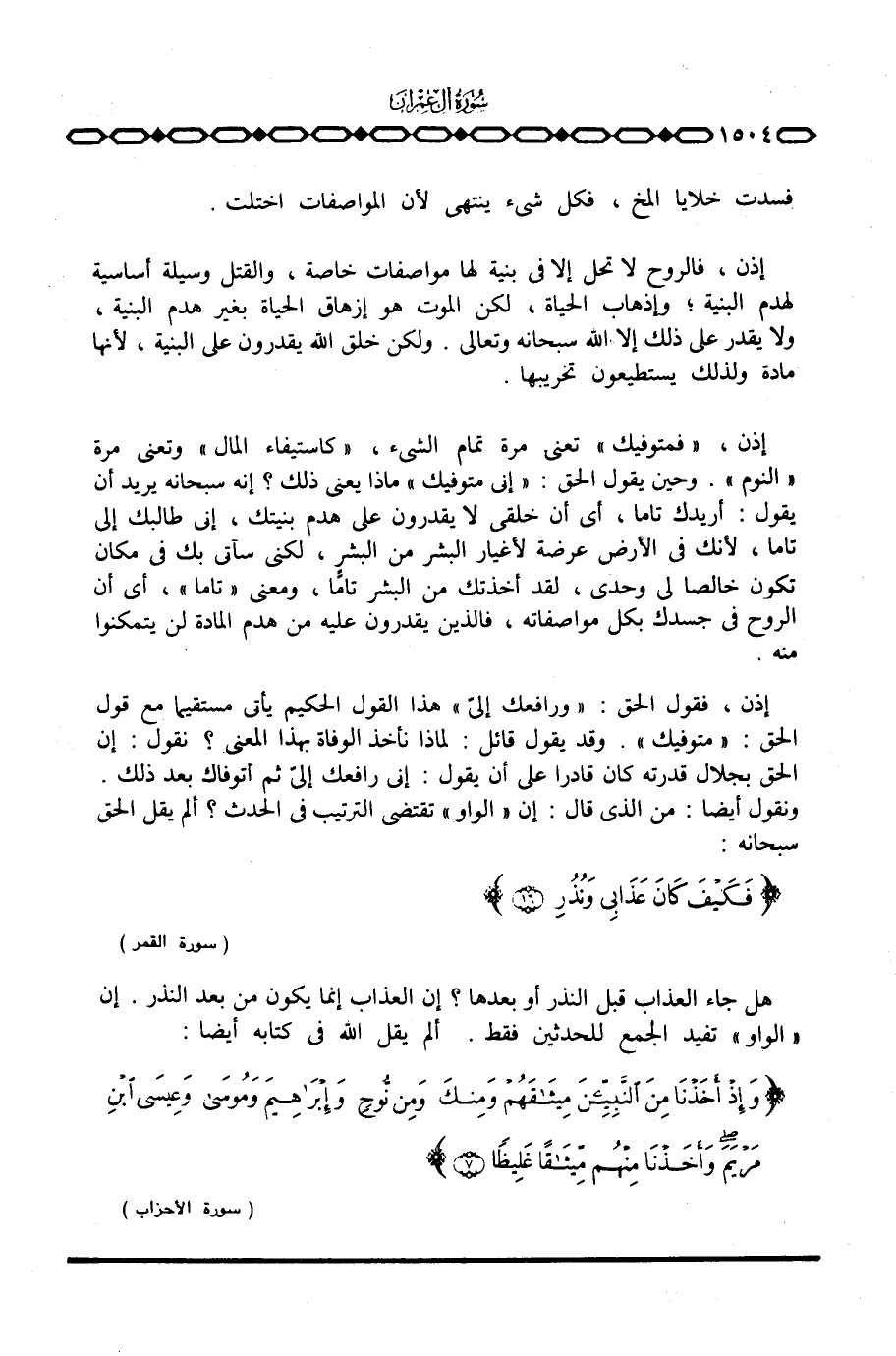 إذن، فقول الحق: {وَرَافِعُكَ إِلَيَّ} هذا القول الحكيم يأتي مستقيما مع قول الحق: {مُتَوَفِّيكَ} . وقد يقول قائل: لماذا نأخذ الوفاة بهذا المعنى؟ نقول: إن الحق بجلال قدرته كان قادرا على أن يقول: إني رافعك إليّ ثم أتوفاك بعد ذلك. ونقول أيضا: من الذي قال: إن «الواو» تقتضي الترتيب في الحدث؟ ألم يقل الحق سبحانه: {فَكَيْفَ كَانَ عَذَابِي وَنُذُرِ} [القمر: 16] .