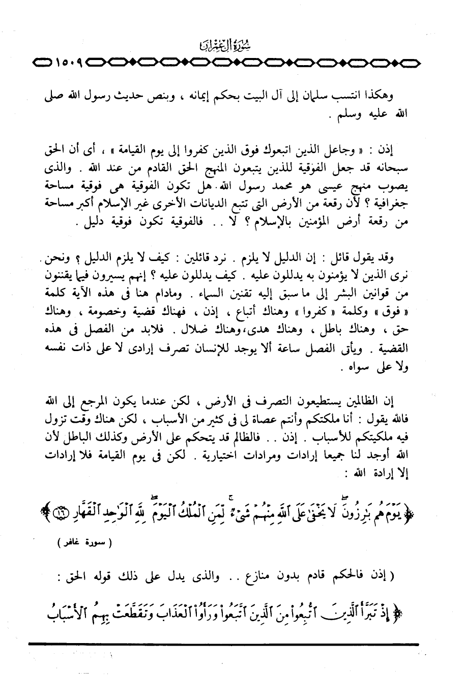 وقد يقول قائل: إن الدليل لا يلزم. نرد قائلين: كيف لا يلزم الدليل؟ ونحن نرى الذين لا يؤمنون به يدللون عليه. كيف يدللون عليه؟ إنهم يسيرون فيما يقننون من قوانين البشر إلى ما سبق إليه تقنين السماء. وما دام هنا في هذه الآية كلمة «فوق» وكلمة «كفروا» وهناك أتباع إذن، فهناك قضية وخصومة، وهناك حق، وهناك باطل، وهناك هدى، وهناك ضلال. فلا بد من الفصل في هذه القضية.