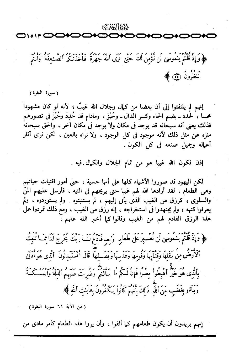 إنهم لم يلتفتوا إلى أن بعضا من كمال وجلال الله غيبٌ؛ لأنه لو كان مشهودا محسا، لحدد - بضم الحاء وكسر الدال - وحُيِّزَ، وما دام قد حُدِدَ وحُيِّزَ في تصورهم فذلك يعني أنه سبحانه قد يوجد في مكان ولا يوجد في مكان آخر، والحق سبحانه منزه عن مثل ذلك لأنه موجود في كل الوجود، ولا نراه بالعين، لكن نرى آثار أعماله وجميل صنعه في كل الكون.