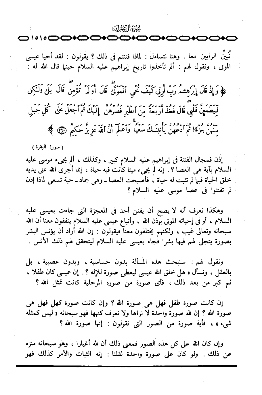 وهكذا نعرف انه لا يصح أن يفتن أحد في المعجزة التي جاءت بعيسى عليه السلام، أو في إحيائه الموتى بإذن الله، وأتباع عيسى عليه السلام يتفقون معنا أن الله سبحانه وتعالى غيب، ولكنهم يختلفون معنا فيقولون: إن الله أراد أن يؤنس البشر بصورة يتجلى لهم فيها بشرا فجاء بعيسى عليه السلام ليتحقق لهم ذلك الأنس.