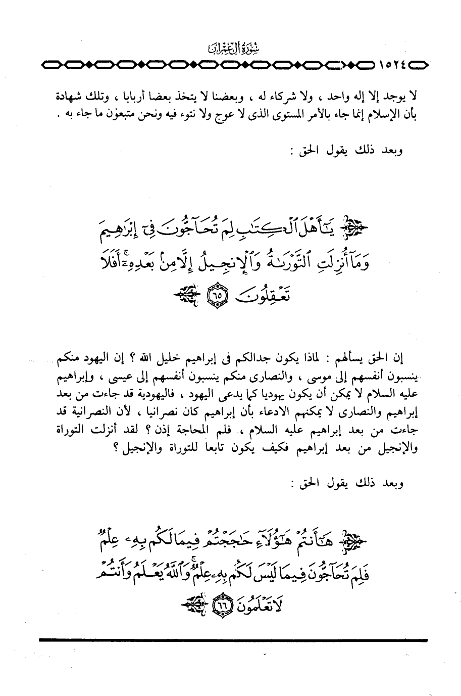 إن الحق يسألهم: لماذا يكون جدالكم في إبراهيم خليل الله؟ إن اليهود منكم ينسبون أنفسهم إلى موسى، والنصارى منكم ينسبون أنفسهم إلى عيسى، وإبراهيم عليه السلام لا يمكن أن يكون يهوديا كما يدعي اليهود، فاليهودية قد جاءت من بعد إبراهيم والنصارى لا يمكنهم الادعاء بأن إبراهيم كان نصرانيا، لأن النصرانية قد جاءت من بعد إبراهيم عليه السلام، فلم المحاجة إذن؟ لقد أنزلت التوراة والإنجيل من بعد إبراهيم فكيف يكون تابعا للتوراة والإنجيل؟