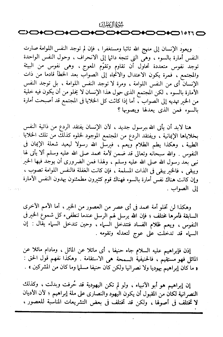 هنا لابد أن يأتي الله برسول جديد، لأن الإنسان يفتقد الردع من ذاتية النفس بخلاياها الإيمانية، ويفتقد الردع من المجتمع الموجود لخلوه كذلك من تلك الخلايا الطيبة، وهكذا يطم الظلام ويعم، فيرسل الله رسولا ليعيد شعلة الإيمان في النفوس. والله سبحانه وتعالى قد ضمن لأمة محمد صَلَّى اللَّهُ عَلَيْهِ وَسَلَّم َ ألا يأتي لها نبي بعد رسول الله صَلَّى اللَّهُ عَلَيْهِ وَسَلَّم َ، ولهذا فمن الضروري أن يوجد فيها الخير ويبقى، فالخير يبقى في الذات المسلمة، فإذا كانت الغفلة فالنفس اللوامة تصوب، وإن كانت هناك نفس أمارة بالسوء فهناك قوم كثيرون مطمئنون يهدون النفس الأمارة إلى الصواب.