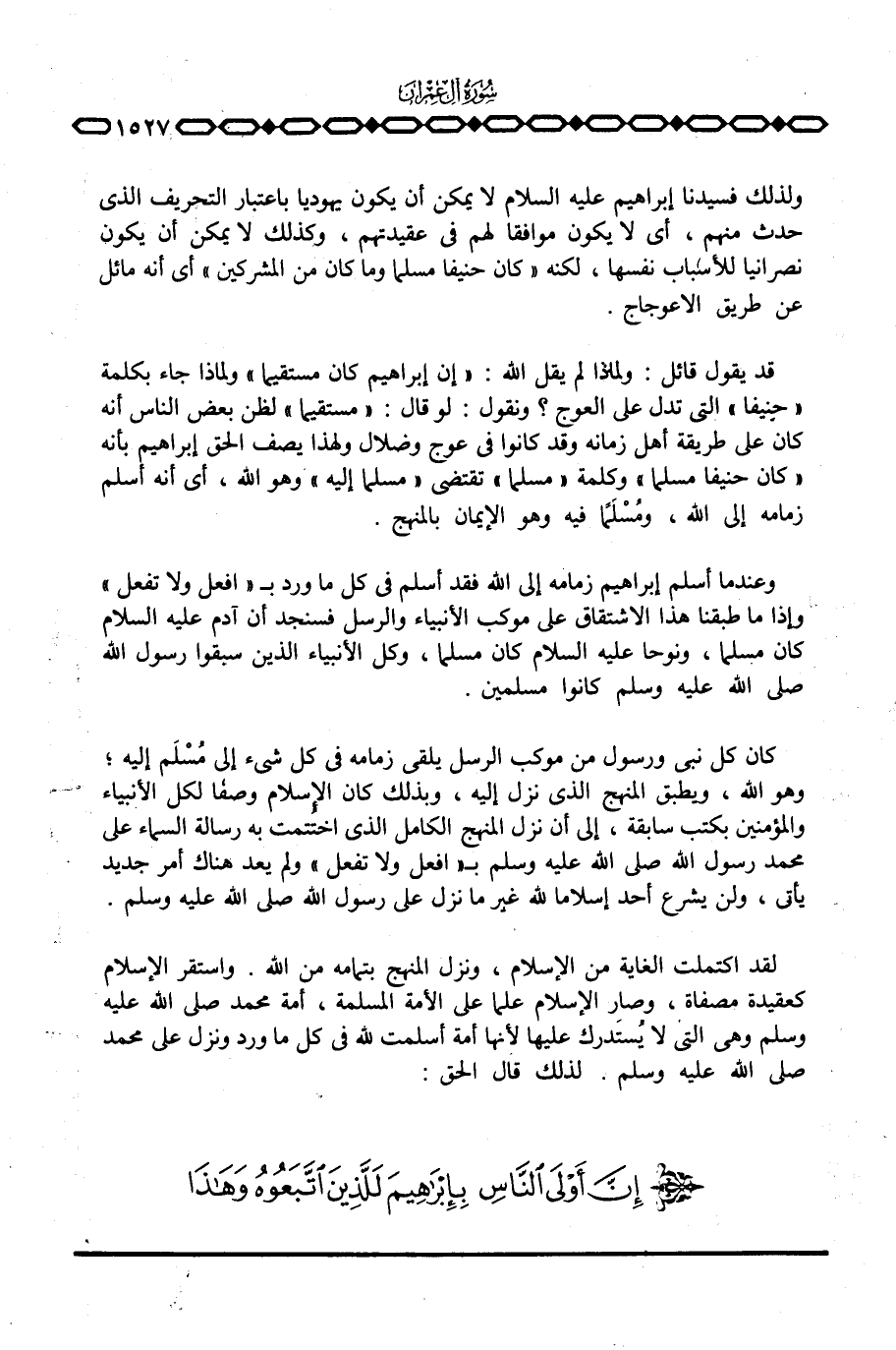قد يقول قائل: ولماذا لم يقل الله: «إن إبراهيم كان مستقيما» ولماذا جاء بكلمة «حنيفا» التي تدل على العوج؟ ونقول: لو قال: «مستقيما» لظن بعض الناس أنه كان على طريقة أهل زمانه وقد كانوا في عوج وضلال ولهذا يصف الحق إبراهيم بأنه {كَانَ حَنِيفاً مُّسْلِماً} وكلمة {مُّسْلِماً} تقتضي «مسلما إليه» وهو الله، أي أنه أسلم زمامه إلى الله، ومُسْلَماً فيه وهو الإيمان بالمنهج.