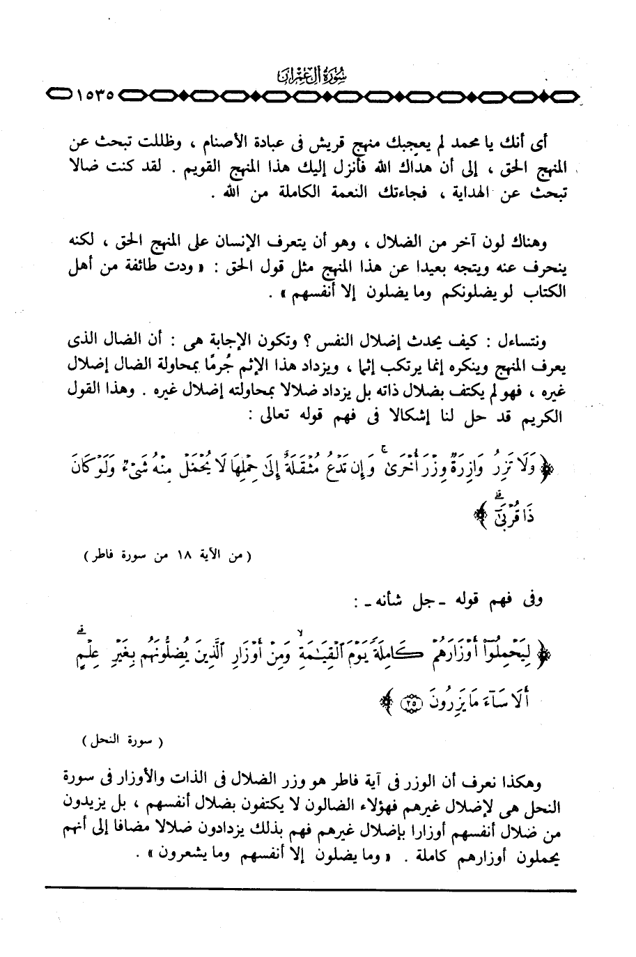 وهكذا نعرف أن الوزر في آية فاطر هو وزر الضلال في الذات والأوزار في سورة النحل هي لإضلال غيرهم فهولاء الضالون لا يكتفون بضلال أنفسهم، بل يزيدون من ضلال انفسهم اوزاراً بإضلال غيرهم فهم بذلك يزدادون ضلالا مضافا إلى أنهم يحملون أوزارهم كاملة. {وَمَا يُضِلُّونَ إِلاَّ أَنْفُسَهُمْ وَمَا يَشْعُرُونَ} .