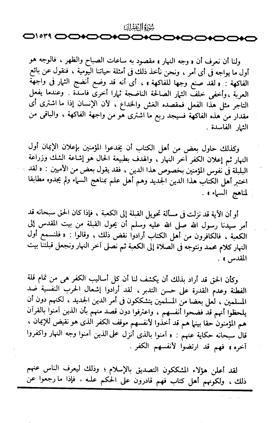ولنا أن نعرف أن {وَجْهَ النهار} مقصود به ساعات الصباح والظهر، فالوجه هو أول ما يواجه في أي أمر، ونحن نأخذ ذلك في أمثلة حياتنا اليومية، فنقول عن بائع الفاكهة: «لقد صنع وجها للفاكهة» ، أي أنه قد وضع أنضج الثمار في واجهة العربة، وأخفى خلف الثمار الصالحة الناضجة ثمارا أخرى فاسدة. وعندما يفعل التاجر مثل هذا الفعل فمقصده الغش والخداع، لأن الإنسان إذا ما اشترى أي مقدار من هذه الفاكهة فسيجد ربع ما اشترى هو من واجه الفاكهة، والباقي من الثمار الفاسدة.