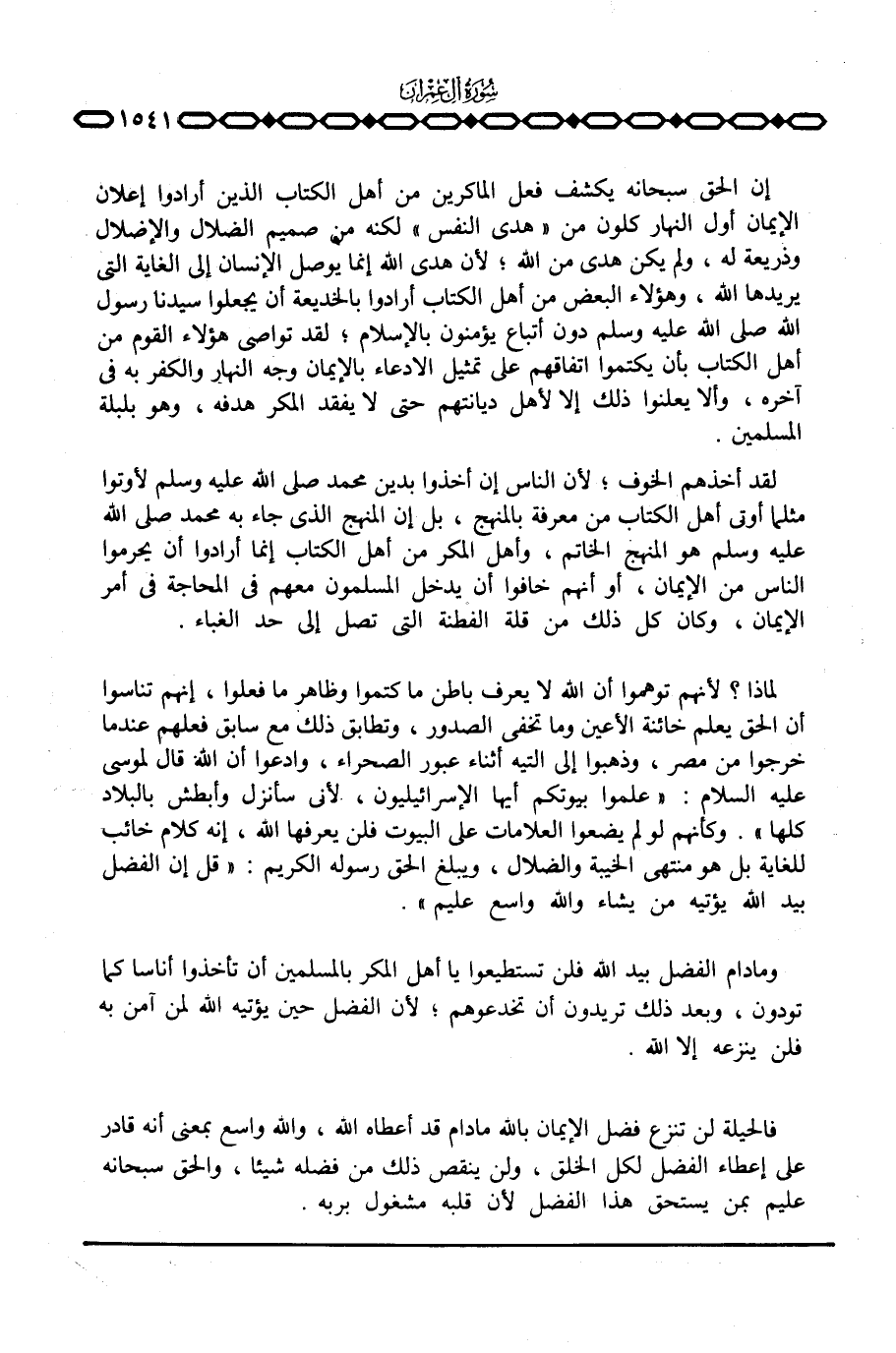 إن الحق سبحانه يكشف فعل الماكرين من أهل الكتاب الذين أرادوا إعلان الإيمان أول النهار كلون من «هدى النفس» لكنه من صميم الضلال والإضلال وذريعة له، ولم يكن هدى من الله؛ لأن هدى الله إنما يوصل الإنسان إلى الغاية التي يريدها الله، وهؤلاء البعض من أهل الكتاب أرادوا بالخديعة أن يجعلوا سيدنا رسول الله صَلَّى اللَّهُ عَلَيْهِ وَسَلَّم َ دون أتباع يؤمنون بالإسلام؛ لقد تواصي هؤلاء القوم من أهل الكتاب بأن يكتموا اتفاقهم على تمثيل الادعاء بالإيمان وجه النهار والكفر به في آخره، وألا يعلنوا ذلك إلا لأهل ديانتهم حتى لا يفقد المكر هدفه، وهو بلبلة المسلمين.
