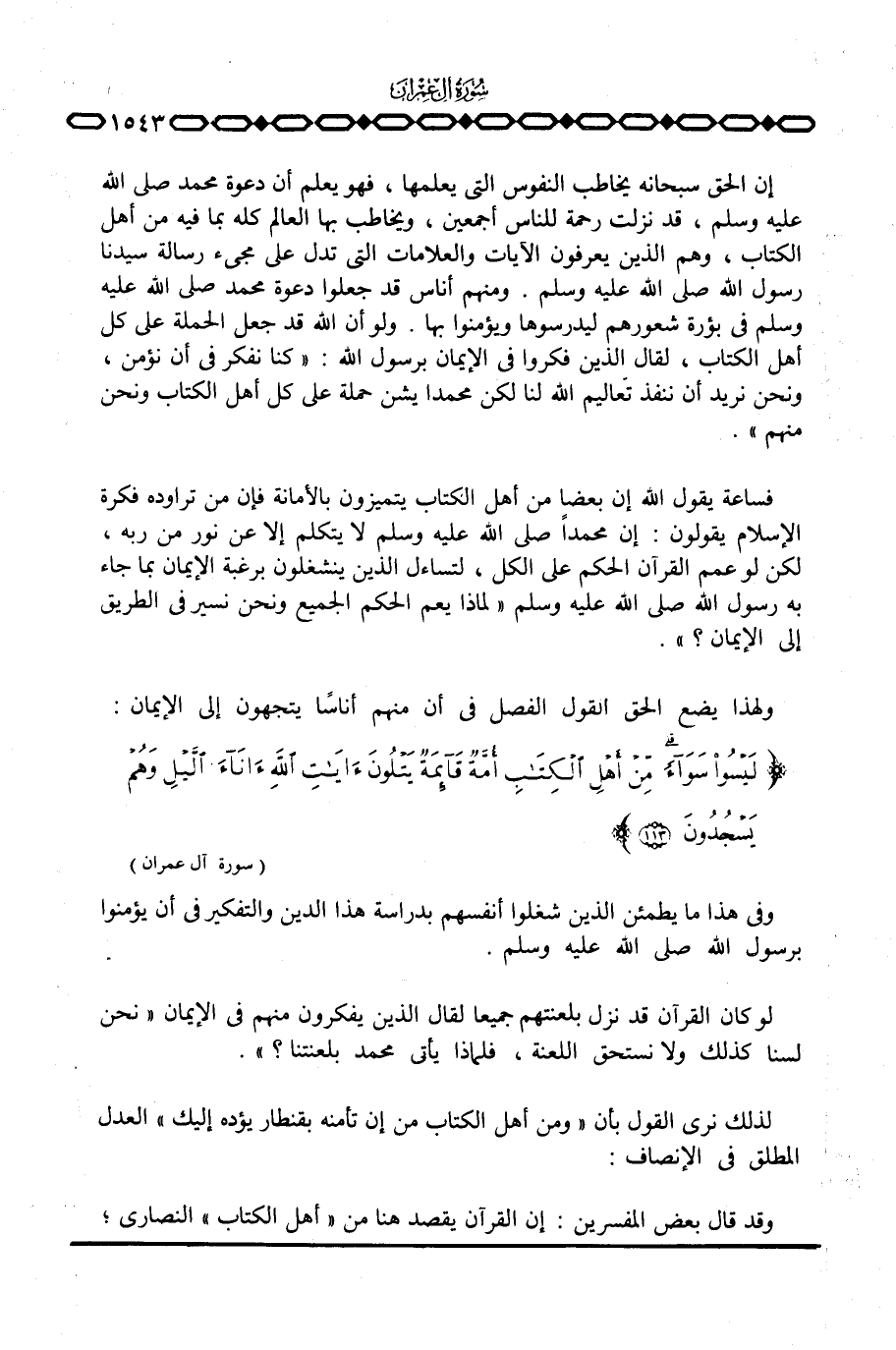 فساعة يقول الله إن بعضا من أهل الكتاب يتميزون بالأمانة فإن من تراوده فكرة الإسلام يقولون: إن محمد صَلَّى اللَّهُ عَلَيْهِ وَسَلَّم َ لا يتكلم إلا عن نور من ربه، لكن لو عمم القرآن الحكم على الكل، لتساءل الذين ينشغلون برغبة الإيمان بما جاء به رسول الله صَلَّى اللَّهُ عَلَيْهِ وَسَلَّم َ «لماذا يعم الحكم الجميع ونحن نسير في الطريق إلى الإيمان؟» .