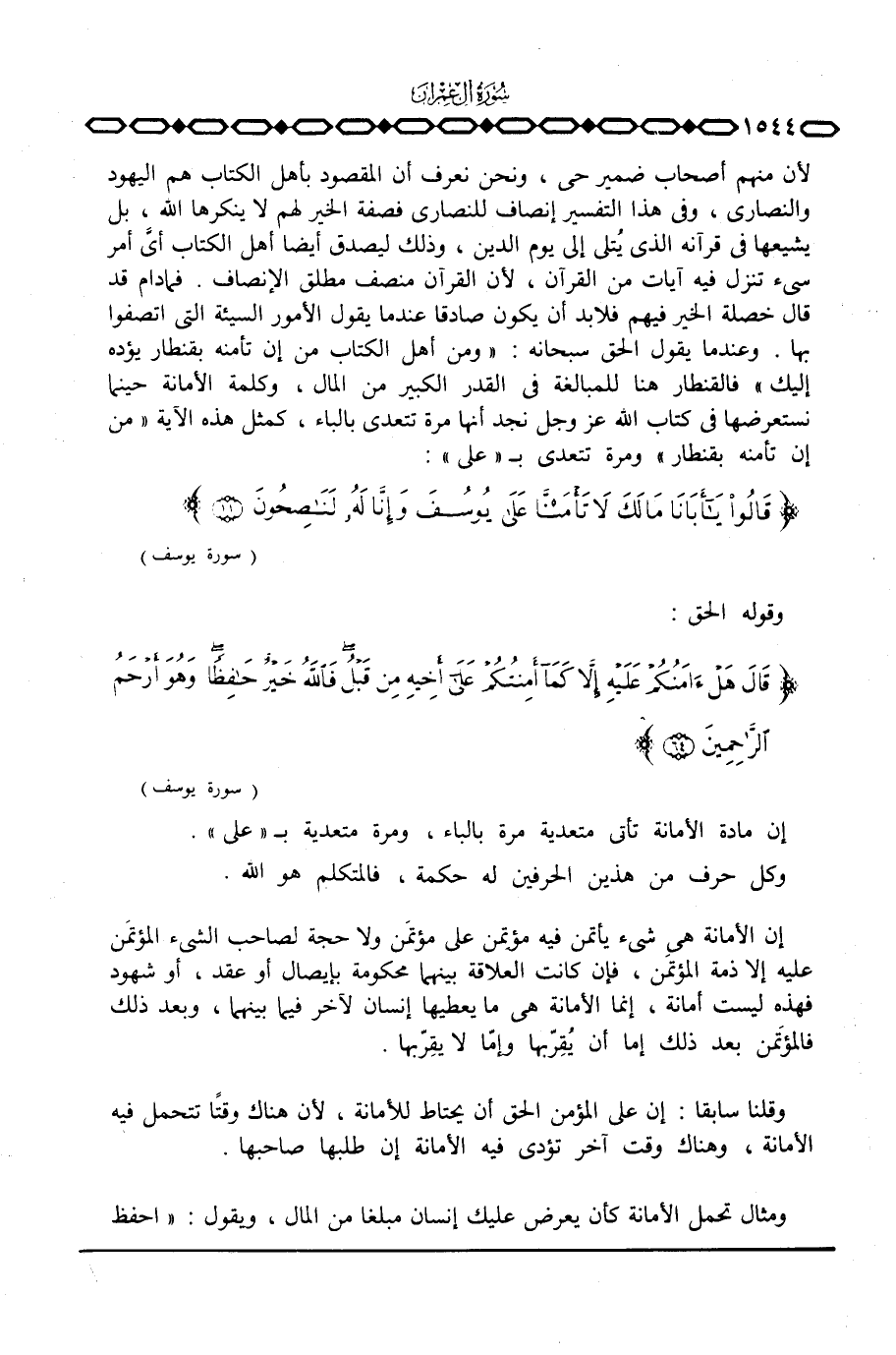 وعندما يقول الحق سبحانه: «ومن أهل الكتاب من إن تأمنه بقنطار يؤده إليك» فالقنطار هنا للمبالغة في القدر الكبير من المال، وكلمة الأمانة حينما نستعرضها في كتاب الله عَزَّ وَجَلَّ نجد أنها مرة تتعدى بالباء، كمثل هذه الآية {مَنْ إِن تَأْمَنْهُ بِقِنْطَارٍ} ومرة تتعدى ب «على» : {قَالُواْ ياأبانا مَا لَكَ لاَ تَأْمَنَّا على يُوسُفَ وَإِنَّا لَهُ لَنَاصِحُونَ} [يوسف: 11] وقوله الحق {قَالَ هَلْ آمَنُكُمْ عَلَيْهِ إِلاَّ كَمَآ أَمِنتُكُمْ على أَخِيهِ مِن قَبْلُ فالله خَيْرٌ حَافِظاً وَهُوَ أَرْحَمُ الراحمين} [يوسف: 64] .