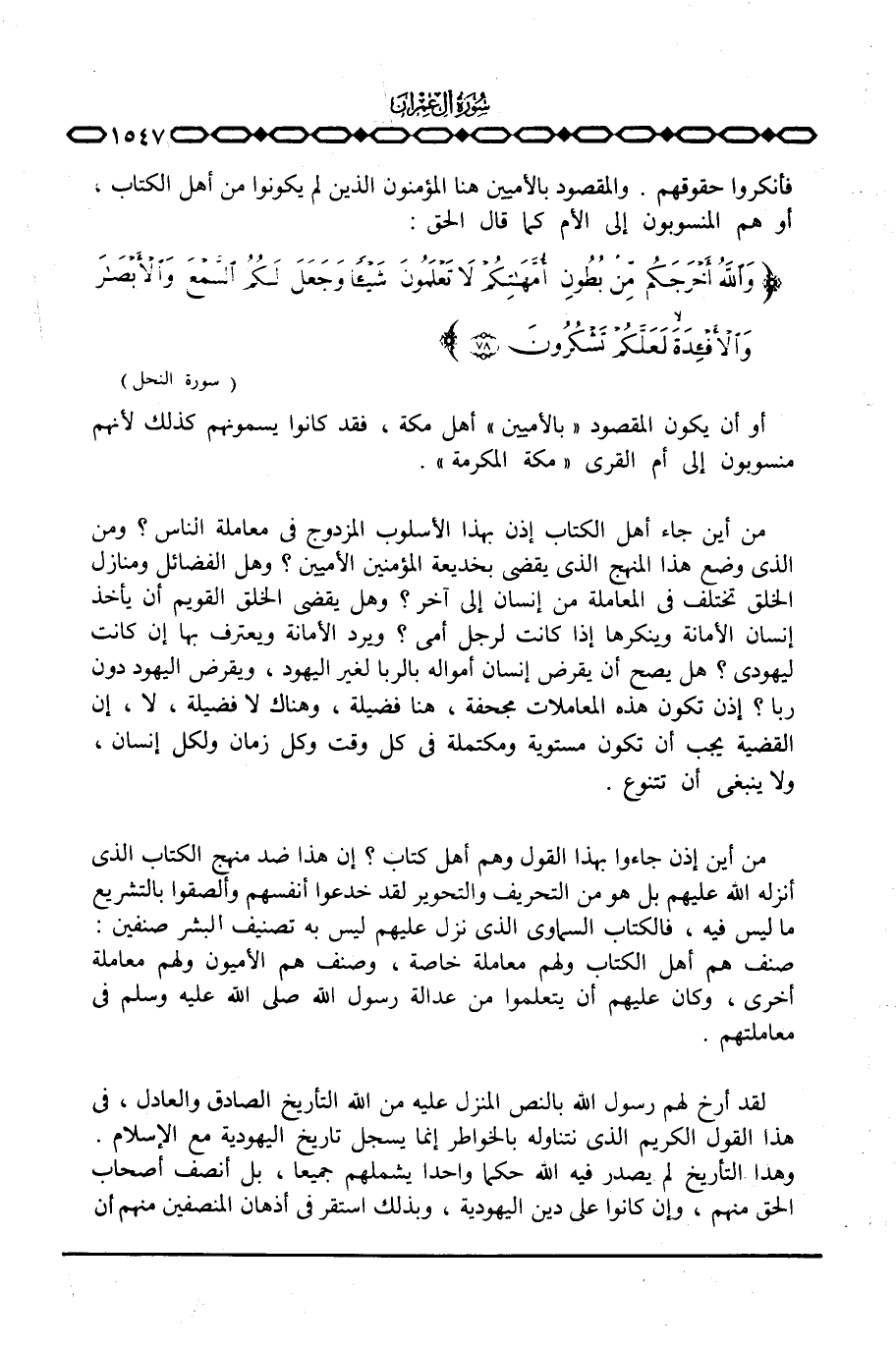 من أين جاء أهل الكتاب إذن بهذا الأسلوب المزدوج في معاملة الناس؟ ومن الذي وضع هذا المنهج الذي يقضي بخديعة المؤمنين الأميين؟ وهل الفضائل ومنازل الخلق تختلف في المعاملة من إنسان إلى آخر؟ وهل يقضي الخلق القويم أن يأخذ إنسان الأمانة وينكرها إذا كانت لرجل أمي؟ ويرد الأمانة ويعترف بها إن كانت ليهودي؟ هل يصح أن يقرض إنسان أمواله بالربا لغير اليهود، ويقرض اليهود دون ربا؟ إذن تكون هذه المعاملات مجحفة، هنا فضيلة، وهناك لا فضيلة، لا، إن القضية يجب أن تكون مستوية ومكتملة في كل وقت وكل زمان ولكل إنسان، ولا ينبغي أن تتنوع.