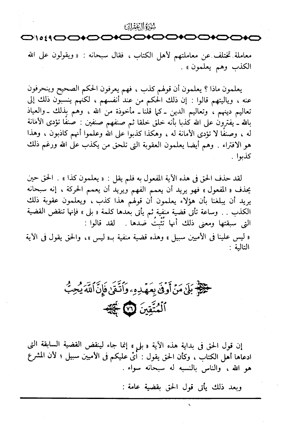«ليس علينا في الأميين سبيل» وهذه قضية منفية ب «ليس» ، والحق يقول في الآية التالية: {بلى مَنْ أوفى بِعَهْدِهِ وَاتَّقَى فَإِنَّ اللَّهَ يُحِبُّ الْمُتَّقِينَ}