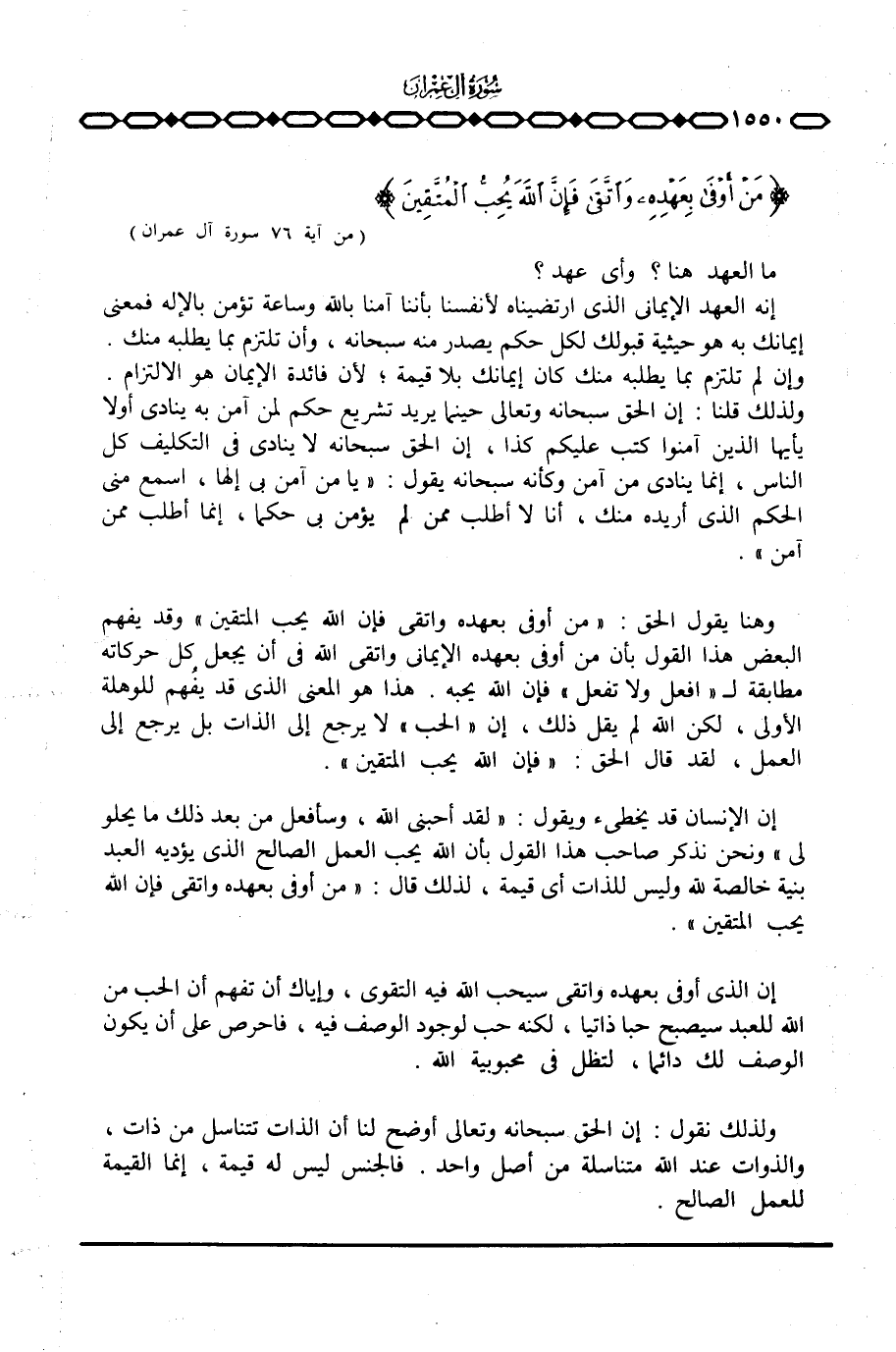 وهنا يقول الحق: {مَنْ أوفى بِعَهْدِهِ وَاتَّقَى فَإِنَّ اللَّهَ يُحِبُّ الْمُتَّقِينَ} وقد يفهم البعض هذا القول بأن من أوفى بعهده الإيماني واتقى الله في أن يجعل كل حركاته مطابقة ل «افعل ولا تفعل» فإن الله يحبه. هذا هو المعنى الذي قد يُفهم للوهلة الأولى، لكن الله لم يقل ذلك، إن «الحب» لا يرجع إلى الذات بل يرجع إلى العمل، لقد قال الحق: {فَإِنَّ اللَّهَ يُحِبُّ الْمُتَّقِينَ} .