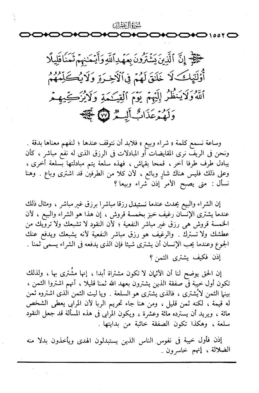 إن الحق يوضح لنا أن الأثمان لا تكون مشتراة أبدا، إنها مُشترى بها، ولذلك تكون أول خيبة في صفقة الذين يشترون بعهد الله ثمنا قليلا، إنهم اشتروا الثمن، بينما الثمن لا يُشترى، فالذي يشتري هو السلعة. ويا ليت الثمن الذي اشتروه ثمن له قيمة، لكنه ثمن قليل، ومن هنا جاء تحريم الربا لأن المرابي يعطي الشخص مائة، ويريد أن يسترده مائة وعشرة، ويكون المرابي في هذه المسألة قد جعل النقود سلعة، وهكذا تكون الصفقة خائبة من بدايتها.