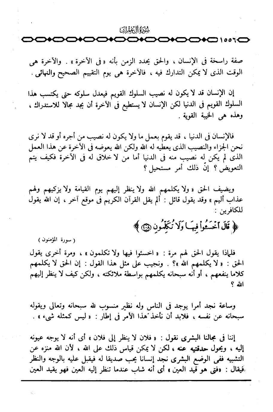 ويضيف الحق {ولاَ يُكَلِّمُهُمُ الله وَلاَ يَنظُرُ إِلَيْهِمْ يَوْمَ القيامة وَلاَ يُزَكِّيهِمْ وَلَهُمْ عَذَابٌ أَلِيمٌ} وقد يقول قائل: ألم يقل القرآن الكريم في موقع آخر، إن الله يقول للكافرين: {قَالَ اخسئوا فِيهَا وَلاَ تُكَلِّمُونِ} [المؤمنون: 108] .
