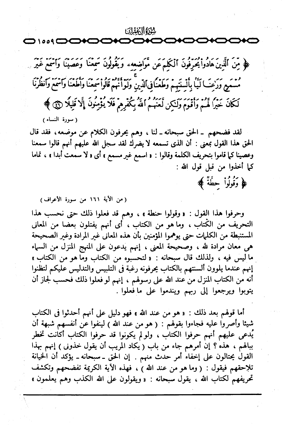 {مِّنَ الذين هَادُواْ يُحَرِّفُونَ الكلم عَن مَّوَاضِعِهِ وَيَقُولُونَ سَمِعْنَا وَعَصَيْنَا واسمع غَيْرَ مُسْمَعٍ وَرَاعِنَا لَيّاً بِأَلْسِنَتِهِمْ وَطَعْناً فِي الدين وَلَوْ أَنَّهُمْ قَالُواْ سَمِعْنَا وَأَطَعْنَا واسمع وانظرنا لَكَانَ خَيْراً لَّهُمْ وَأَقْوَمَ وَلَكِن لَّعَنَهُمُ الله بِكُفْرِهِمْ فَلاَ يُؤْمِنُونَ إِلاَّ قَلِيلاً} [النساء: 46] .