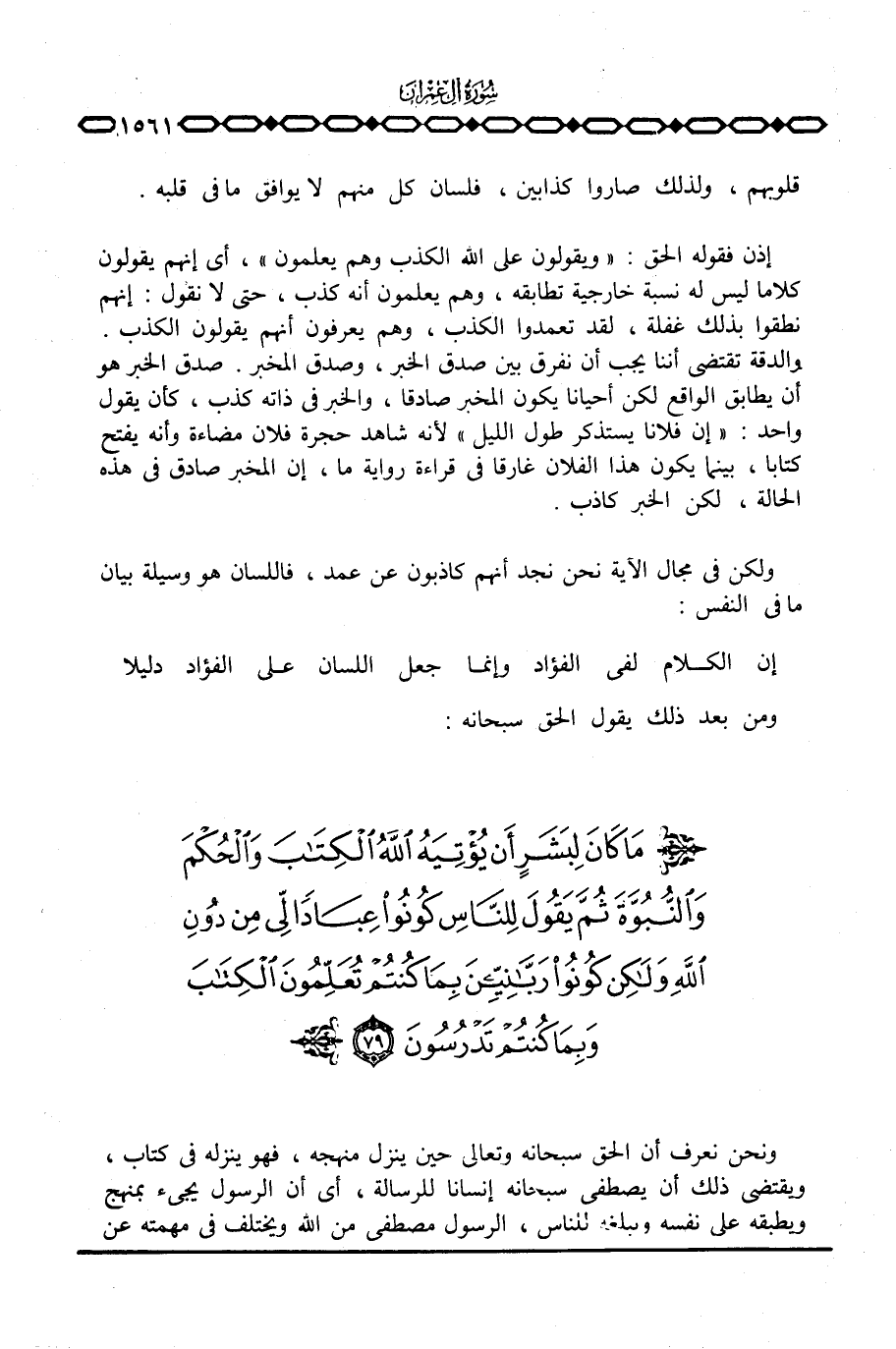 إذن فقوله الحق: {وَيَقُولُونَ عَلَى الله الكذب وَهُمْ يَعْلَمُونَ} ، أي إنهم يقولون كلاما ليس له نسبة خارجية تطابقه، وهم يعلمون أنه كذب، حتى لا نقول: إنهم نطقوا بذلك غفلة، لقد تعمدوا الكذب، وهم يعرفون أنهم يقولون الكذب. والدقة تقتضي أننا يجب أن نفرق بين صدق الخبر، وصدق المخبر. صدق الخبر هو أن يطابق الواقع لكن أحيانا يكون المخبر صادقا، والخبر في ذاته كذب، كأن يقول واحد: «إن فلانا يستذكر طول الليل» لأنه شاهد حجرة فلان مضاءة وأنه يفتح كتابا، بينما يكون هذا الفلان غارقا في قراءة رواية ما، إن المخبر الصادق في هذه الحالة، لكن الخبر كاذب.