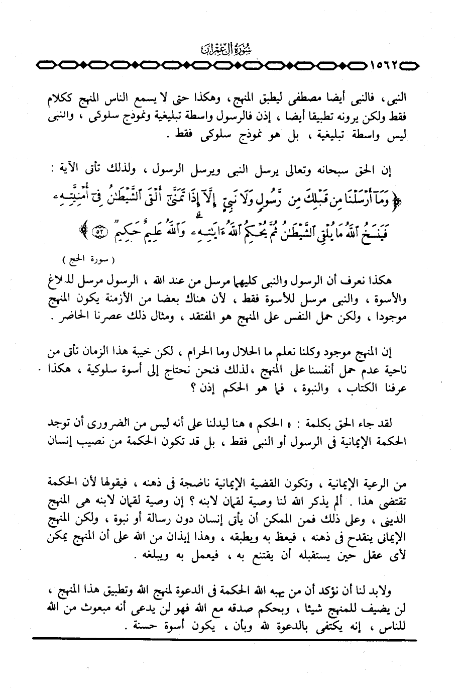 ولابد لنا أن نؤكد أن من يهبه الله الحكمة في الدعوة لمنهج الله وتطبيق هذا المنهج، لن يضيف للمنهج شيئا، وبحكم صدقة مع الله فهو لن يدعي أنه مبعوث من الله للناس، إنه يكتفي بالدعوة لله وبأن، يكون أسوة حسنة.