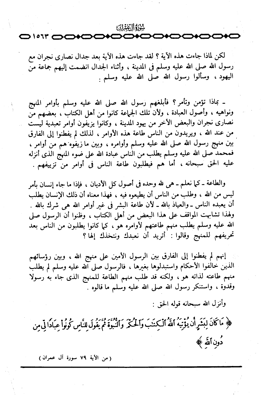 {مَا كَانَ لِبَشَرٍ أَن يُؤْتِيهُ الله الكتاب والحكم والنبوة ثُمَّ يَقُولَ لِلنَّاسِ كُونُواْ عِبَاداً لِّي مِن دُونِ الله} [آل عمران: 79]