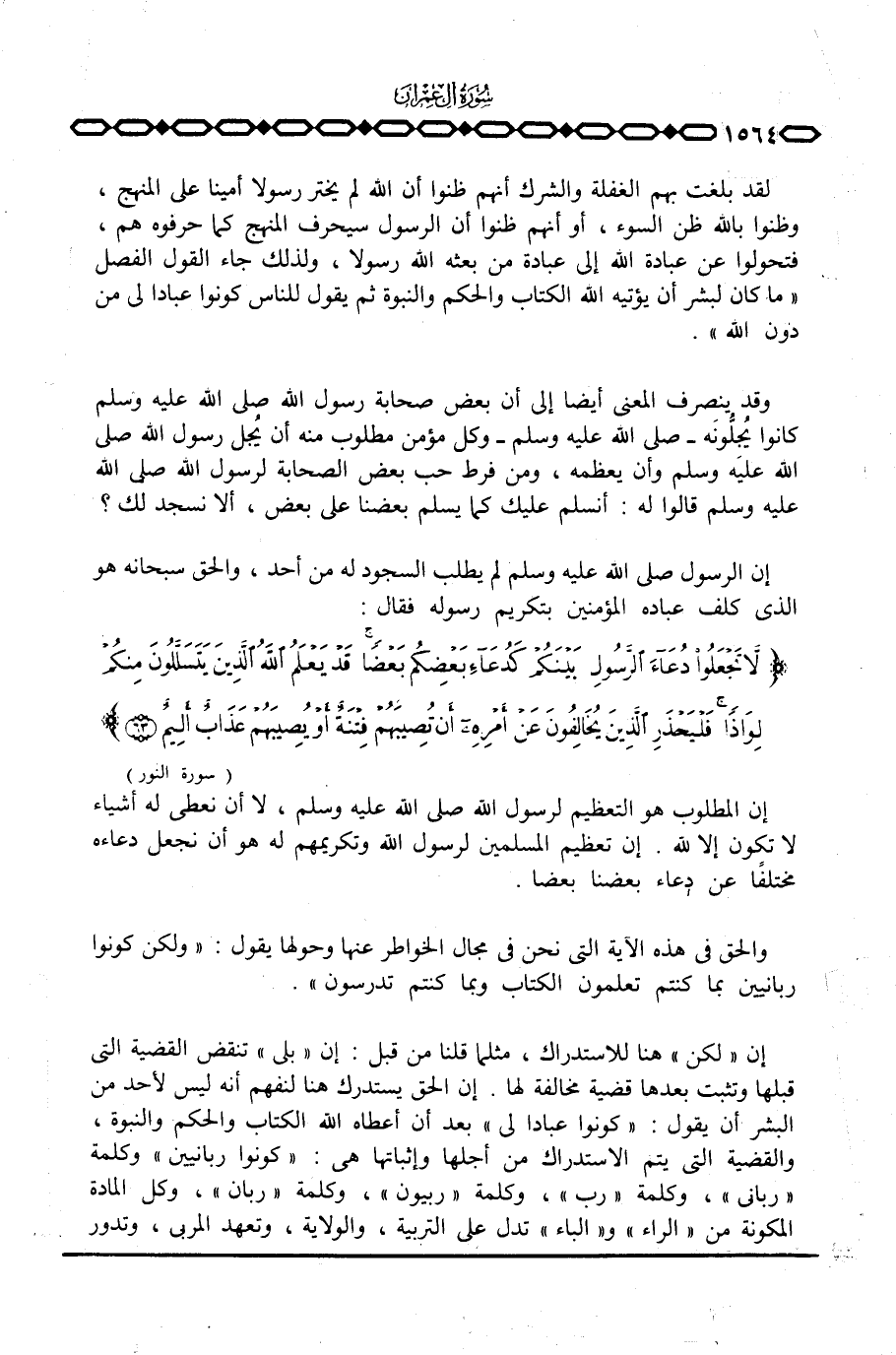 إن «لكن» هنا للاستدراك، مثلما قلنا من قبل: إن «بلى» تنقض القضية التي قبلها وتثبت بعدها قضية مخالفة لها. إن الحق يستدرك هنا لنفهم أنه ليس لأحد من البشر أن يقول: «كونوا عبادا لي» بعد أن أعطاه الله الكتاب والحكم والنبوة، والقضية التي يتم الاستدراك من أجلها وإثباتها هي: {كُونُواْ رَبَّانِيِّينَ} وكلمة «رباني» ، وكلمة «رب» ، وكلمة «ربيون» ، وكلمة «ربان» ، وكل المادة المكونة من «الراء» و «الباء» تدل على التربية، والولاية، وتعهد المربي، وتدور