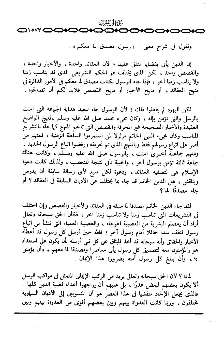 إن الدين يأتي بقضايا متفق عليها؛ لأن العقائد واحدة، والأخبار واحدة، والقصص واحد، لكن الذي يختلف هو الحكم التشريعي الذي قد يناسب زمنا ولا يناسب زمنا آخر، فإذا جاء الرسول بكتاب مصدق لما معكم في الأمور الدائرة في منهج العقائد، أو منهج القصص فلا بد لكم أن تصدقوه.