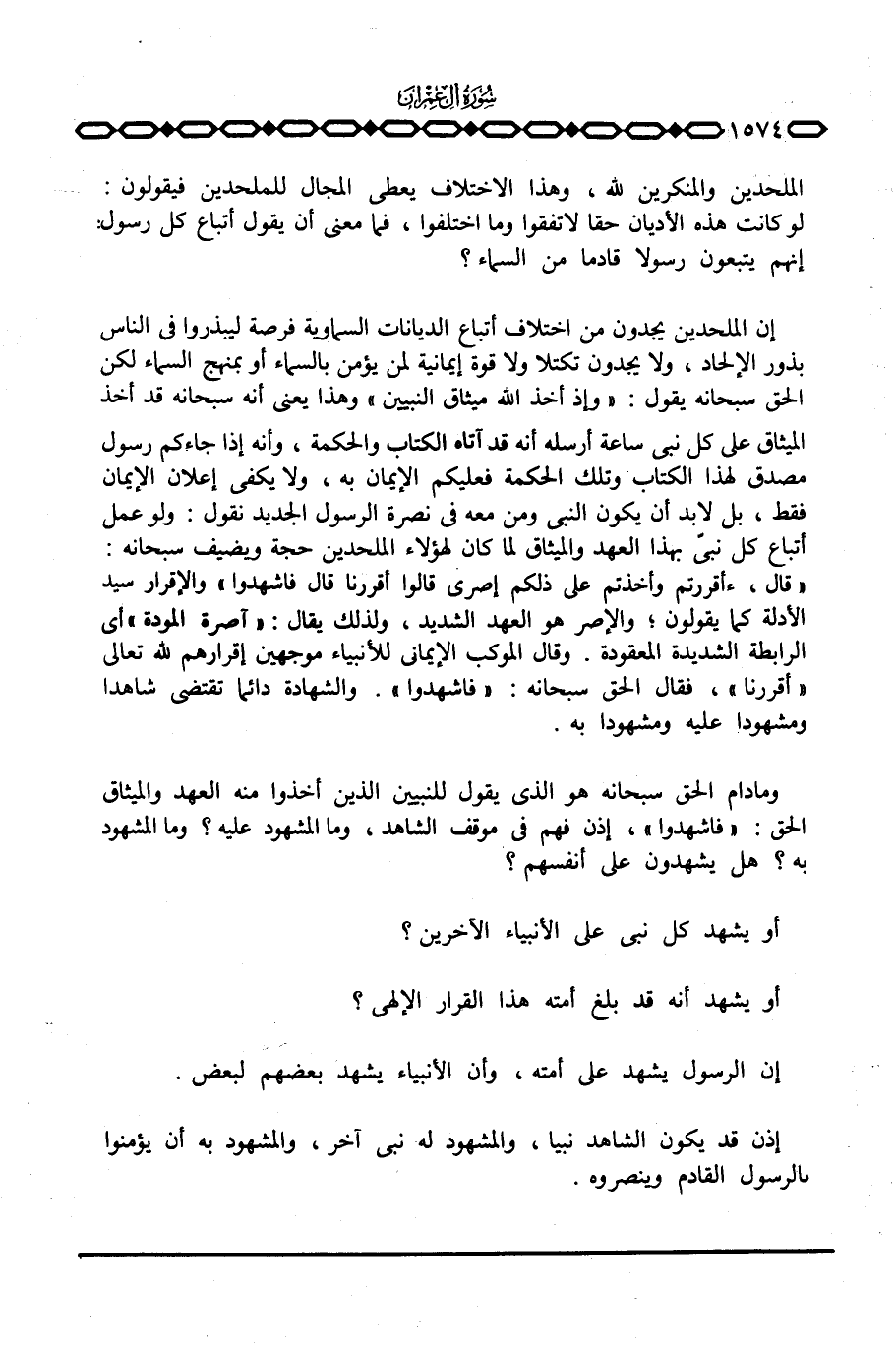إن الملحدين يجدون من اختلاف أتباع الديانات السماوية فرصة ليبذروا في الناس بذور الإلحاد، ولا يجدون تكتلا ولا قوة إيمانية لمن يؤمن بالسماء أو بمنهج السماء لكن الحق سبحانه يقول: {وَإِذْ أَخَذَ الله مِيثَاقَ النبيين} وهذا يعني أنه سبحانه قد أخذ الميثاق على كل نبي ساعة أرسله أنه قد آتاه الكتاب والحكمة، وإنه إذا جاءكم رسول مصدق لهذا الكتاب وتلك الحكمة فعليكم الإيمان به، ولا يكفي إعلان الإيمان فقط، بل لا بد أن يكون النبي ومن معه في نصرة الرسول الجديد نقول: ولو عمل أتباع كل نبيّ بهذا العهد والميثاق لما كان لهؤلاء الملحدين حجة ويضيف سبحانه: {قَالَ أَأَقْرَرْتُمْ وَأَخَذْتُمْ على ذلكم إِصْرِي قالوا أَقْرَرْنَا قَالَ فاشهدوا} والإقرار سيد الأدلة كما يقولون؛ والإصر هو العهد الشديد، ولذلك يقال: «آصره المودة» أي الرابطة الشديدة المعقودة. قال الموكب الإيماني للأنبياء موجهين إقرارهم لله تعالى {أَقْرَرْنَا} ، فقال الحق سبحانه: {فاشهدوا} . والشهادة دائما تقتضي شاهدا ومشهودا عليه ومشهودا به.