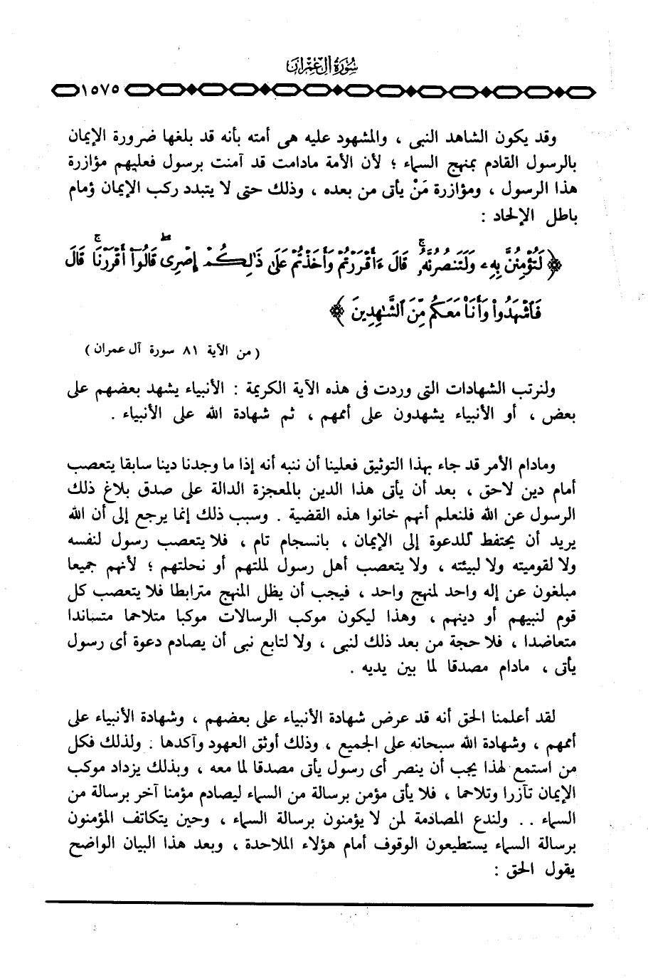 لقد أعلمنا الحق أنه قد عرض شهادة الأنبياء على بعضهم، وشهادة الأنبياء على أممهم، وشهادة الله سبحانه على الجميع، وذلك أوثق العهود وآكدها. ولذلك يزداد موكب الإيمان تآزرا وتلاحما، فلا يأتي مؤمن برسالة من السماء ليصادم مؤمنا آخر برسالة من السماء. . ولندع المصادمة لمن لا يؤمنون برسالة السماء، وحين يتكاتف المؤمنون برسالة السماء يستطيعون الوقوف أمام هؤلاء الملاحدة، وبعد هذا البيان الواضح يقول الحق: