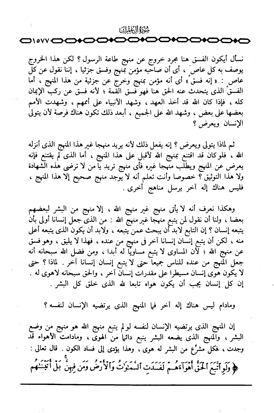 وهكذا نعرف أنه لا يأتي منهج غير منهج الله، إلا منهج من البشر لبعضهم بعضا، ولنا أن نقول لمن يتبع منهجا غير منهج الله: من الذي جعل إنسانا أولى بأن يتبعه إنسان؟ إن التابع لا بد أن يبحث عمن يتبعه، ولا بد أن يكون الذي يتبعه أعلى منه، لكن أن يتبع إنسان إنسانا آخر في منهج من عنده، فهذا لا يليق، وهو فسق عن منهج الله؛ لأن المساوي لا يتبع مساوياً له أبدا، ومن فضل الله سبحانه أنه جعل المنهج من عنده للناس جميعا حتى لا يتبع إنسان إنسانا آخر. لماذا؟ حتى لا يكون هوى إنسان مسيطرا على مقدرات إنسان آخر، والحق سبحانه لا هوى له. إن كل إنسان يجب أن يكون هواه تابعا لله الذي خلق كل البشر.