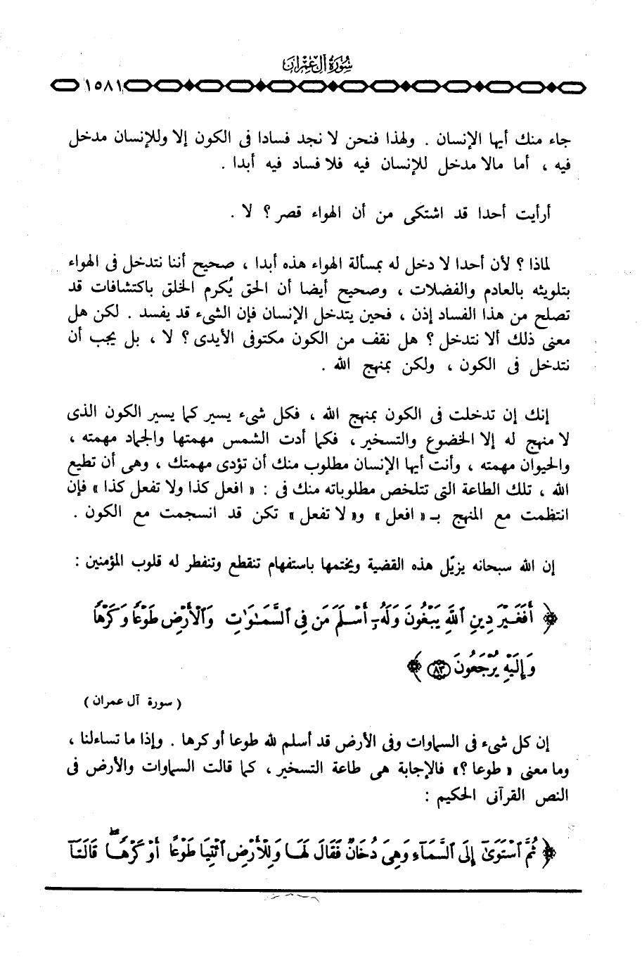 إن كل شيء في السماوات وفي الأرض قد أسلم لله طوعا أو كرها. وإذا ما تساءلنا، وما معنى «طوعا؟» فالإجابة هي طاعة التسخير، كما قالت السماوات والأرض في النص القرآني الحكيم: {ثُمَّ استوى إِلَى السمآء وَهِيَ دُخَانٌ فَقَالَ لَهَا وَلِلأَرْضِ ائتيا طَوْعاً أَوْ كَرْهاً قَالَتَآ