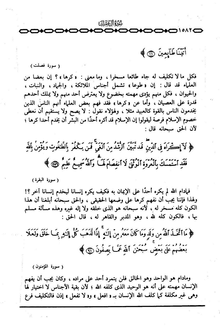 فكل ما لا تكليف له جاء طائعا مسخرا، وما معنى: «كرها» ؟ إن بعضا من العلماء قد قال: إن «طوعا» تشمل أجناس الملائكة، والجماد، والنبات، والحيوان، فكل منهم يؤدي مهمته بخضوع ولا يعترض أحد منهم ولا يملك أحدهم قدرة على العصيان، وأما عن «كرها» فقد فهم بعض العلماء أنهم الناس الذين يخدمون الناس بالقوة كالعبيد مثلا، ولهؤلاء نقول: لا يصح ولا يستقيم أن نعطي خصوم الإسلام فرصة ليقولوا إن الإسلام قد أكره أحداً من البشر أن يخدم أحدا كرها؛ لأن الحق سبحانه قال: {لاَ إِكْرَاهَ فِي الدين قَد تَّبَيَّنَ الرشد مِنَ الغي فَمَنْ يَكْفُرْ بالطاغوت وَيْؤْمِن بالله فَقَدِ استمسك بالعروة الوثقى لاَ انفصام لَهَا والله سَمِيعٌ عَلِيمٌ} [البقرة: 256] .