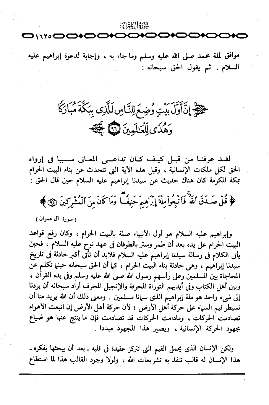 وإبراهيم عليه السلام هو أول الأنبياء صلة بالبيت الحرام، وكان رفع قواعد البيت الحرام على يده بعد أن طمر وستر بالطوفان في عهد نوح عليه السلام، فحين يأتي الكلام في رسالة سيدنا إبراهيم عليه السلام فلا بد أن تأتي أكبر حادثة في تاريخ سيدنا إبراهيم، وهي حادثة بناء البيت الحرام، كما أن الحق سبحانه حينما تكلم عن المحاجاة بين المسلمين وعلى رأسهم رسول الله صَلَّى اللَّهُ عَلَيْهِ وَسَلَّم َ وفي يده القرآن، وبين أهل الكتاب وفي أيديهم التوراة المحرفة والإنجيل المحرف أراد سبحانه أن يردنا إلى شيء واحد هو ملة إبراهيم الذي سمانا مسلمين. ومعنى ذلك أن الله يريد منا أن تسيطر قيم السماء على حركة أهل الأرض؛ لأن حركة أهل الأرض إن اتبعت الأهواء تصادمت الحركات، وما دامت الحركات قد تصادمت فإن ما ينتج عنها هو ضياع مجهود الحركة الإنسانية، ويصير هذا المجهود مبددا.