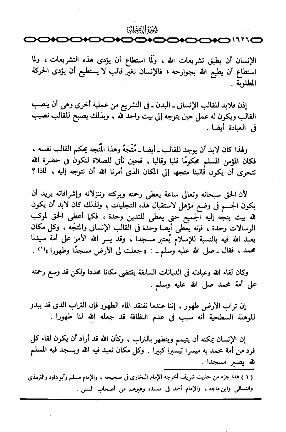 إن الإنسان يمكنه أن يتيمم ويتطهر بالتراب، وكأن الله قد أراد أن يكون لقاء كل فرد من أمة محمد به ميسرا تيسيرا كبيرا. وكل مكان نعبد فيه الله ويسجد فيه المسلم لله يصير مسجدا.