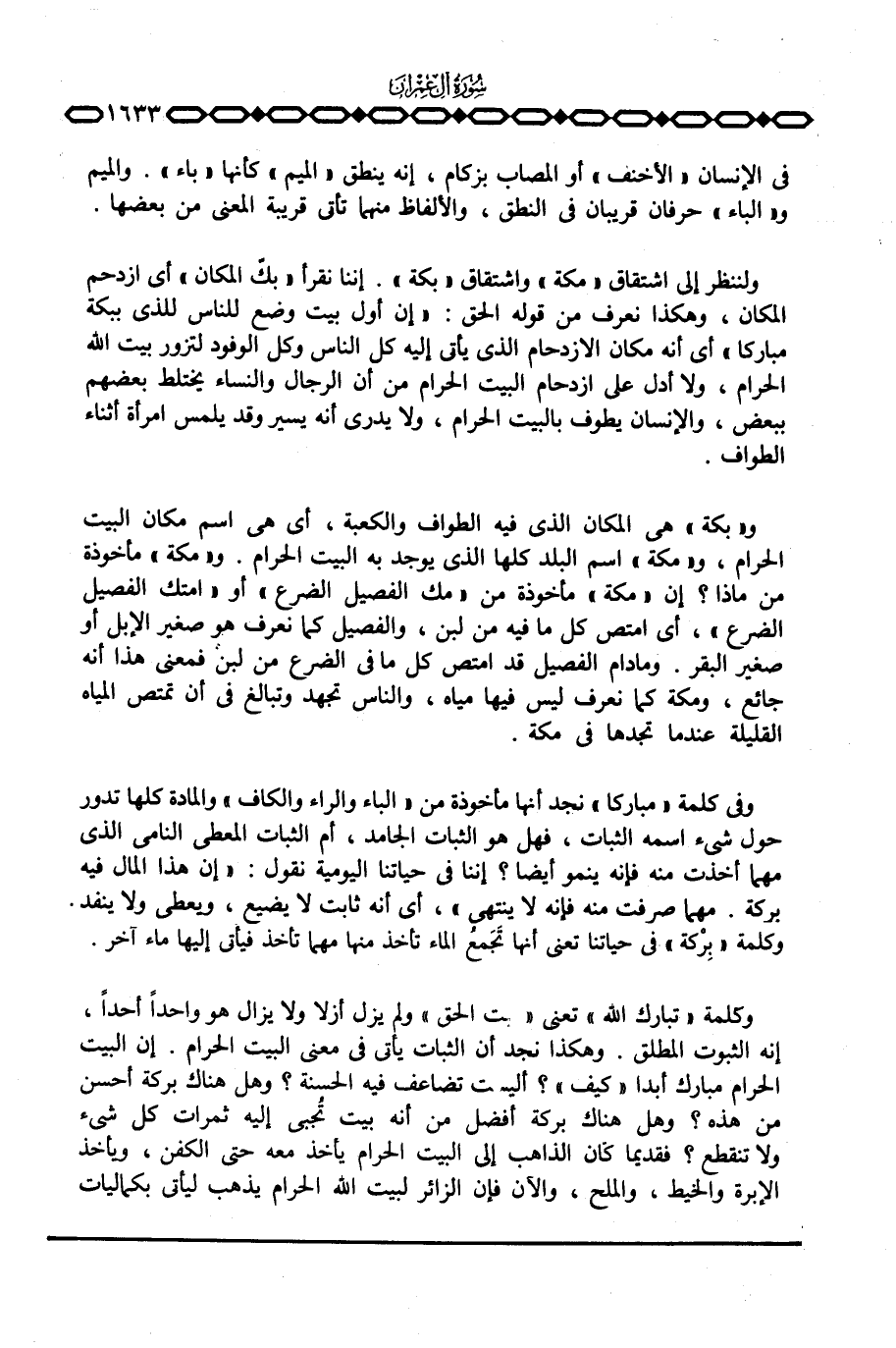 وكلمة «تبارك الله» تعني «ثبت الحق» ولم يزل أزلا ولا يزال هو واحداً أحداً، إنه الثبوت المطلق. وهكذا نجد أن الثبات يأتي في معنى البيت الحرام. إن البيت الحرام مبارك أبدا «كيف» ؟ أليست تضاعف فيه الحسنة؟ وهل هناك بركة أحسن من هذه؟ وهل هناك بركة أفضل من أنه بيت تُجبى إليه ثمرات كل شيء ولا تنقطع؟ فقديما كان الذاهب إلى البيت الحرام يأخذ معه حتى الكفن، ويأخذ الإبرة والخيط، والملح، والآن فإن الزائر لبيت الله الحرام يذهب ليأتي بكماليات