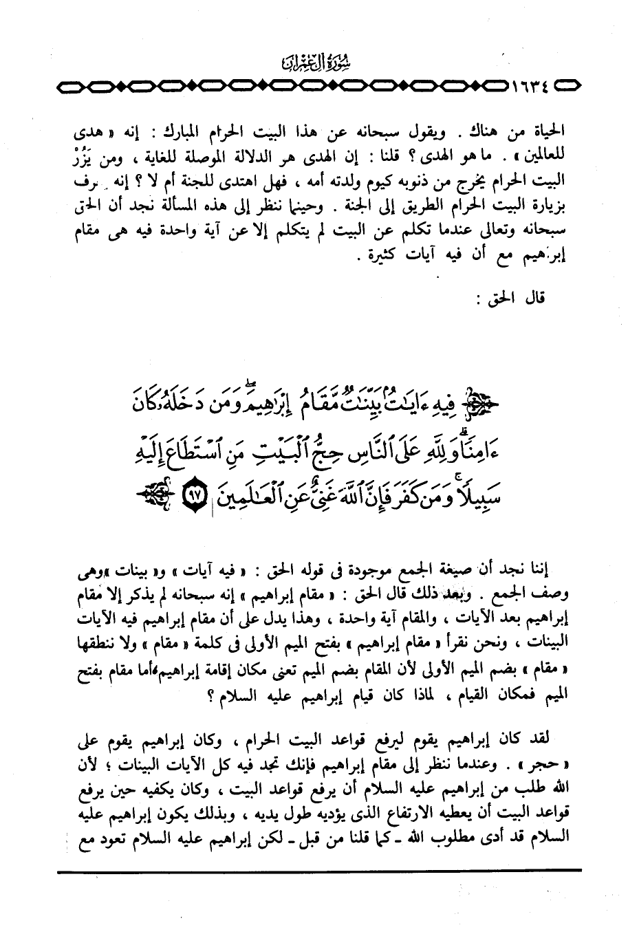 إننا نجد أن صيغة الجمع موجودة في قوله الحق: {فِيهِ آيَاتٌ} و {بَيِّنَاتٌ} وهي وصف الجميع. وبعد ذلك قال الحق: {مَّقَامُ إِبْرَاهِيمَ} إنه سبحانه لم يذكر إلا مقام إبراهيم بعد الآيات، والمقام آية واحدة، وهذا يدل على أن مقام إبراهيم فيه الآيات البينات، ونحن نقرأ {مَّقَامُ إِبْرَاهِيمَ} بفتح الميم الأولى في كلمة «مقام» ولا ننطقها «مقام» بضم الميم الأولى لأن المقام بضم الميم تعني مكان إقامة إبراهيم، أما مقام بفتح الميم فمكان القيام، لماذا كان قيام إبراهيم عليه السلام؟