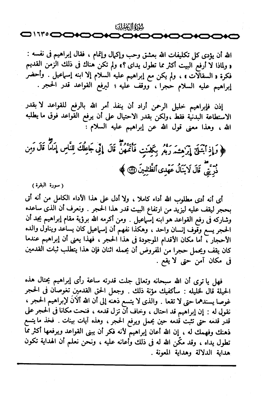 أي أنه أدى مطلوب الله أداء كاملا، ولا أدل على هذا الأداء الكامل من أنه أتى بحجر ليقف عليه ليزيد من ارتفاع البيت قدر هذا الحجر. ونعرف أن الذي ساعده وشاركه في رفع القواعد هو ابنه إسماعيل. ومن أكرمه الله برؤية مقام إبراهيم يجد أن الحجر يسع وقوف إنسان واحد، وهكذا نفهم أن إسماعيل كان يساعد ويناول والده الأحجار، أما مكان الأقدام الموجودة في هذا الحجر، فهذا يعني أن إبراهيم عندما كان يقف ويحمل حجرا من المفروض أن يحمله اثنان فإن هذا يتطلب ثبات القدمين في مكان آمن حتى لا يقع.