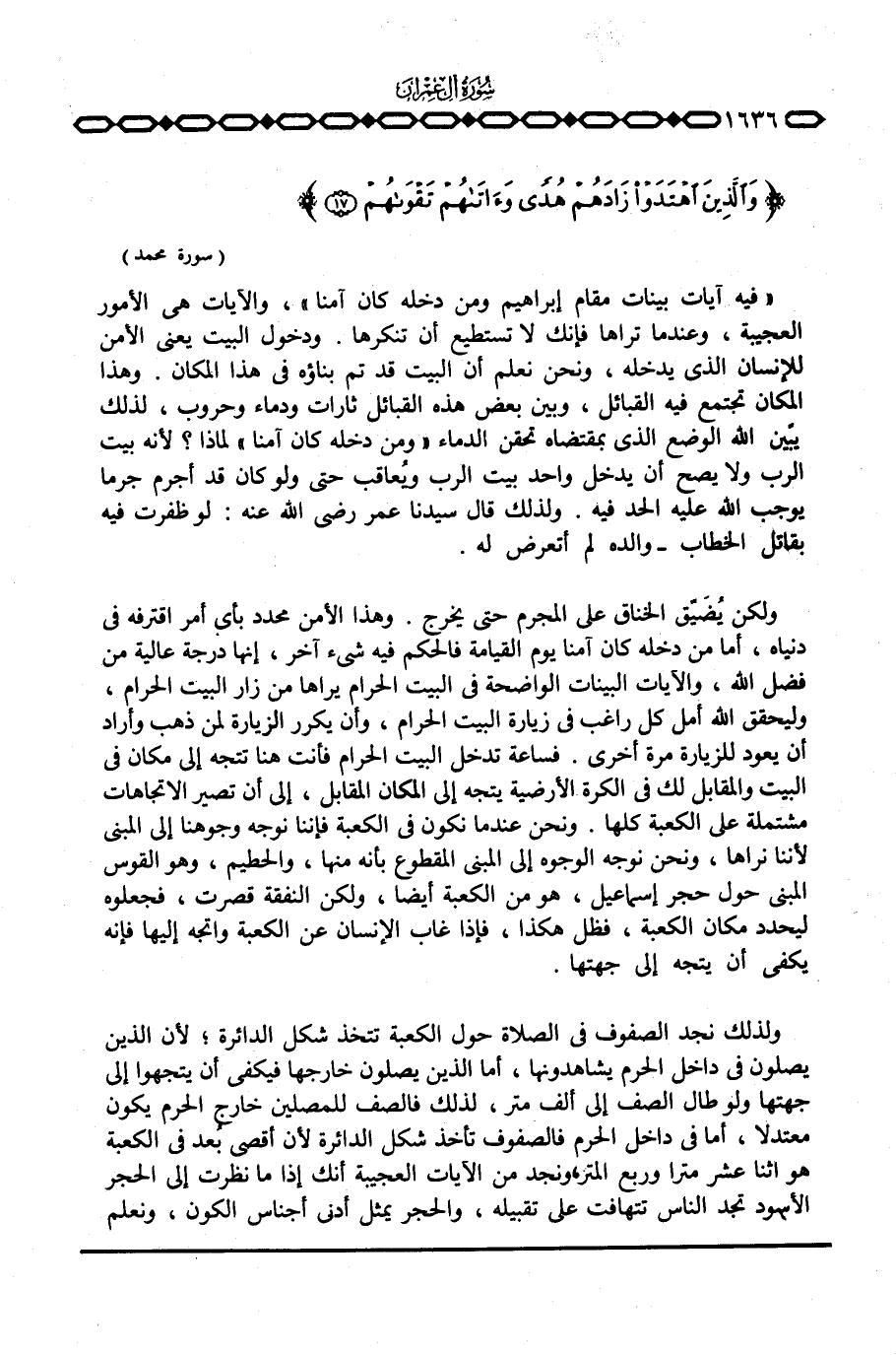 ولكن يُضَيّق الخناق على المجرم حتى يخرج. وهذا الأمن محدد بأي أمر اقترفه في دنياه، أما من دخله كان آمنا يوم القيامة فالحكم فيه شيء آخر، إنها درجة عالية من فضل الله، والآيات البينات الواضحة في البيت الحرام يراها من زار البيت الحرام، وليحقق الله أمل كل راغب في زيارة البيت الحرام، وأن يكرر الزيارة لمن ذهب وأراد أن يعود للزيارة مرة أخرى. فساعة تدخل البيت الحرام فأنت هنا تتجه إلى مكان في البيت والمقابل لك في الكرة الأرضية يتجه إلى المكان المقابل، إلى أن تصير الاتجاهات مشتملة على الكعبة كلها. ونحن عندما نكون في الكعبة فإننا نوجه وجوهنا إلى المبنى لأننا نراها، ونحن نوجه الوجوه إلى المبنى المقطوع بأنه منها، والحطيم، وهو القوس المبنى حول حجر إسماعيل، هو من الكعبة أيضا، ولكن النفقة قصرت، فجعلوه ليحدد مكان الكعبة، فظل هكذا، فإذا غاب الإنسان عن الكعبة واتجه إليها فإنه يكفي أن يتجه إلى جهتها.