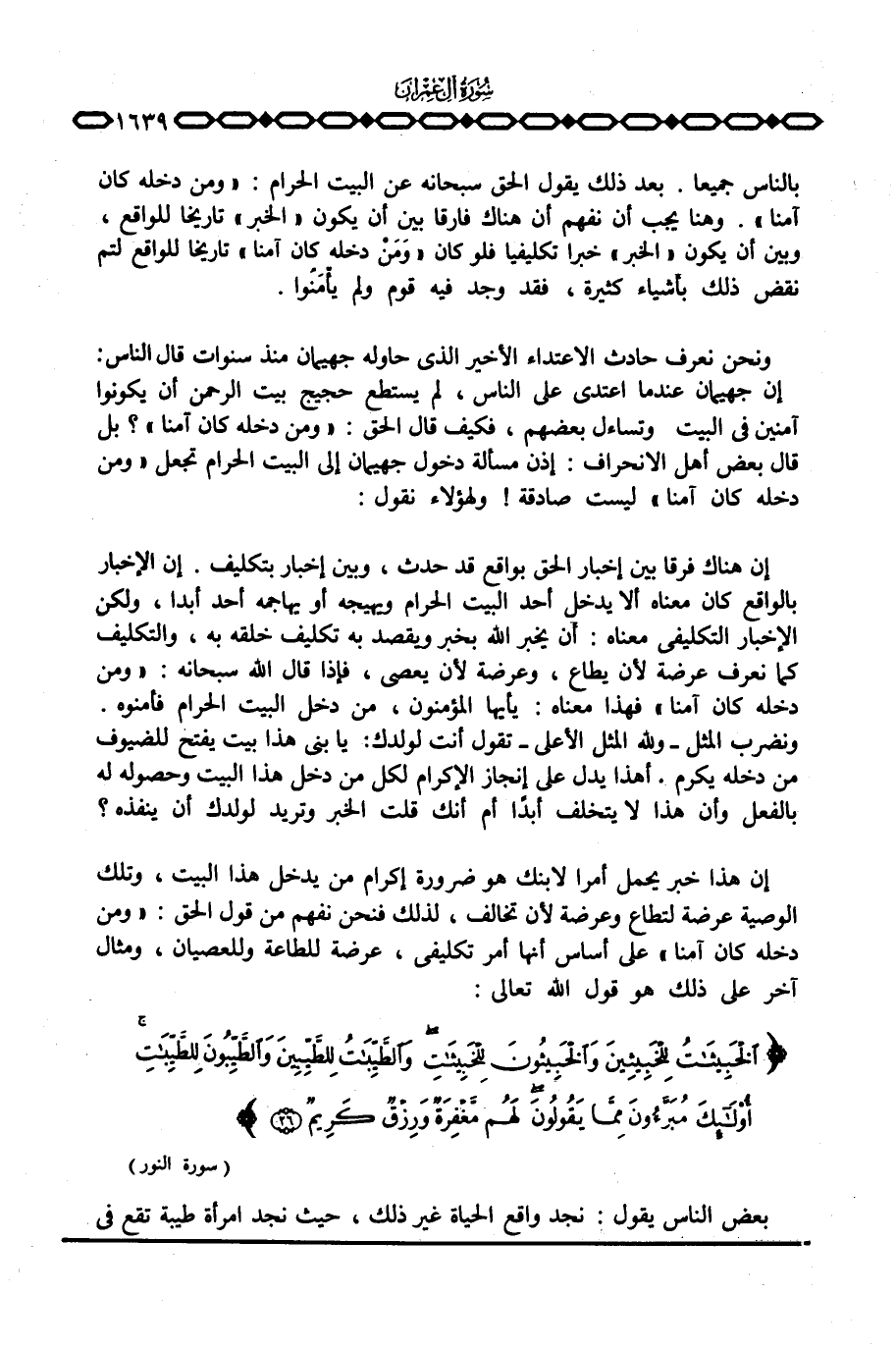 إن الإخبار بالواقع كان معناه ألا يدخل أحد البيت الحرام ويهيجه أو يهاجمه أحد أبدا، ولكن الإخبار التكليفي معناه: أن يخبر الله بخبر ويقصد به تكليف خلقه به، والتكليف كما نعرف عرضة لأن يطاع، وعرضة لأن يعصى، فإذا قال الله سبحانه: {وَمَن دَخَلَهُ كَانَ آمِناً} فهذا معناه: يأيها المؤمنون، من دخل البيت الحرام فأمنوه. ونضرب المثل - ولله المثل الأعلى - تقول أنت لولدك: يا بني هذا بيت يفتح للضيوف من دخله يكرم. أهذا يدل على إنجاز الإكرام لكل من دخل هذا البيت وحصوله له بالفعل وأن هذا لا يتخلف أبداً أم أنك قلت الخبر وتريد لولدك أن ينفذه؟