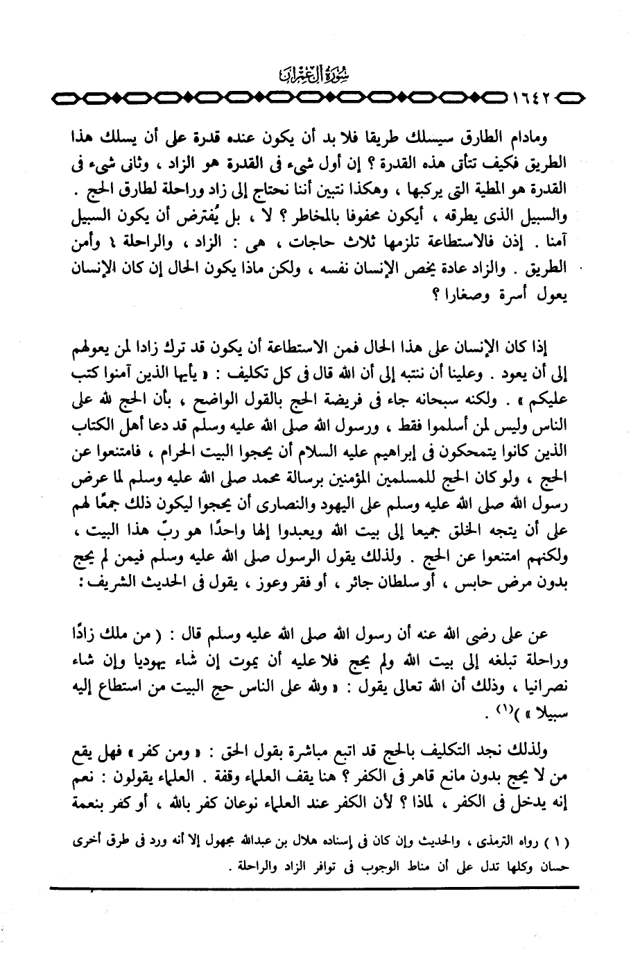 والسبيل الذي يطرقه، أيكون محفوفا بالمخاطر؟ لا، بل يُفترض أن يكون السبيل آمنا. إذن فالاستطاعة تلزمها ثلاث حاجات، هي: الزاد، والراحلة، وأمن الطريق. والزاد عادة يخص الإنسان نفسه، ولكن ماذا يكون الحال إن كان الإنسان يعول أسرة وصغارا؟