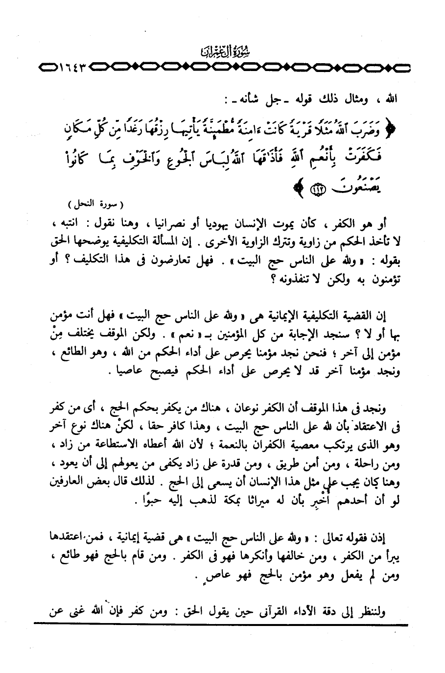 إذن فقوله تعالى: {وَللَّهِ عَلَى الناس حِجُّ البيت} هي قضية إيمانية، فمن اعتقدها يبرأ من الكفر، ومن خالفها وأنكرها فهو في الكفر. ومن قام بالحج فهو طائع، ومن لم يفعل وهو مؤمن بالحج فهو عاصٍ.