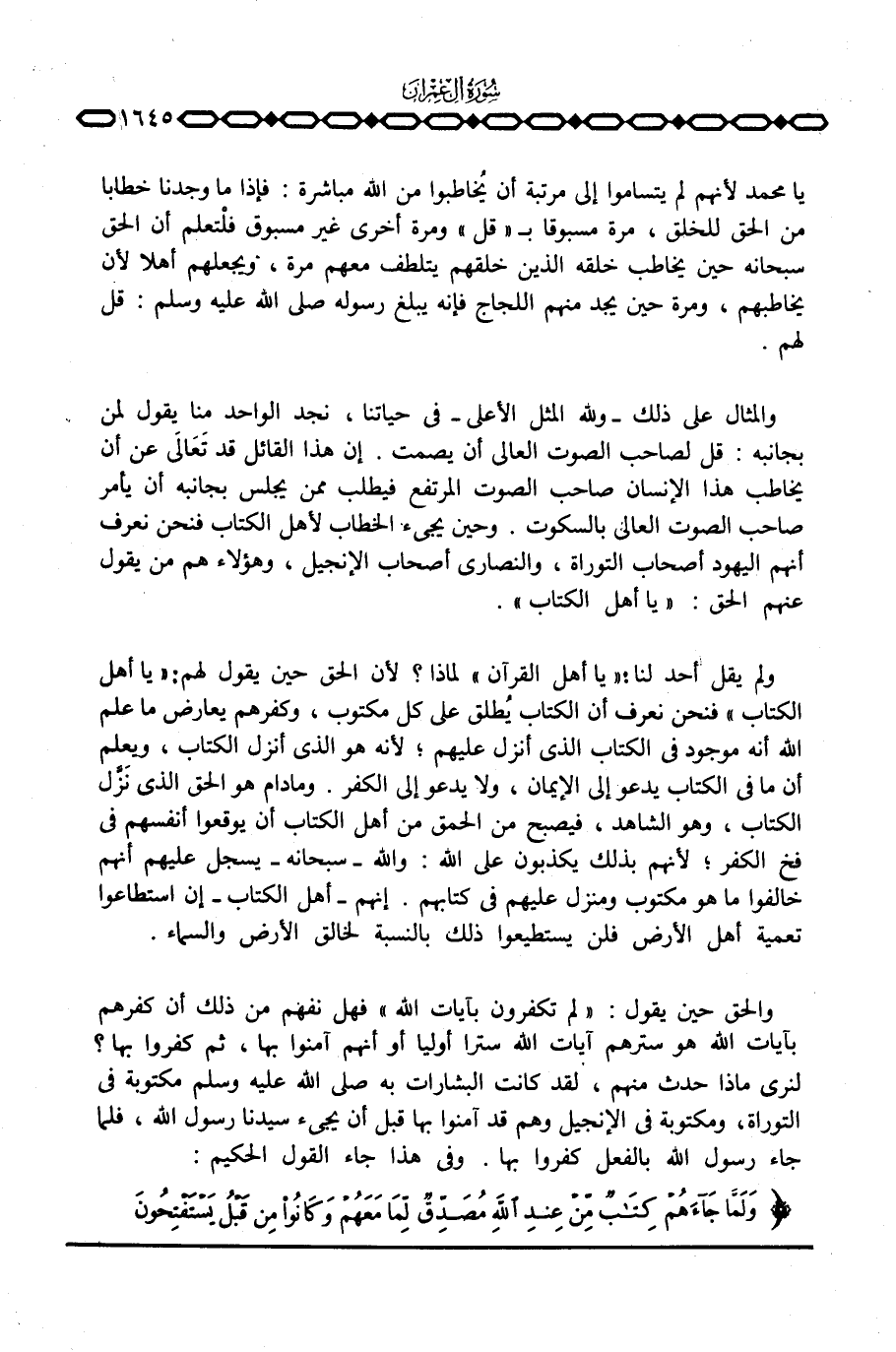 والمثال على ذلك - ولله المثل الأعلى - في حياتنا، نجد الواحد منا يقول لمن بجانبه: قل لصاحب الصوت العالي أن يصمت. إن هذا القائل قد تَعَالَى عن أن يخاطب هذا الإنسان صاحب الصوت المرتفع فيطلب ممن يجلس بجانبه أن يأمر صاحب الصوت العالي بالسكوت. وحين يجيء الخطاب لأهل الكتاب فنحن نعرف أنهم اليهود أصحاب التوراة، والنصارى أصحاب الإنجيل، وهؤلاء هم من يقول عنهم الحق: {ياأهل الكتاب} .