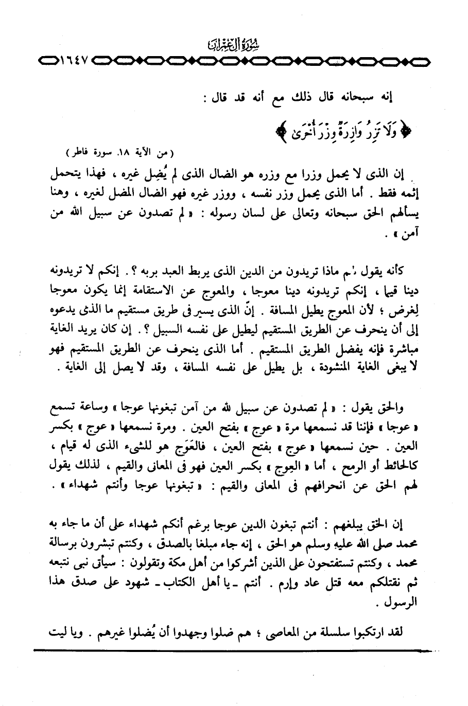 إن الذي لا يحمل وزرا مع وزره هو الضال الذي لم يُضِل غيره، فهذا يتحمل إثمه فقط. أما الذي يحمل وزر نفسه، ووزر غيره فهو الضال المضل لغيره، وهنا يسألهم الحق سبحانه وتعالى على لسان رسوله: {لِمَ تَصُدُّونَ عَن سَبِيلِ الله مَنْ آمَنَ} .