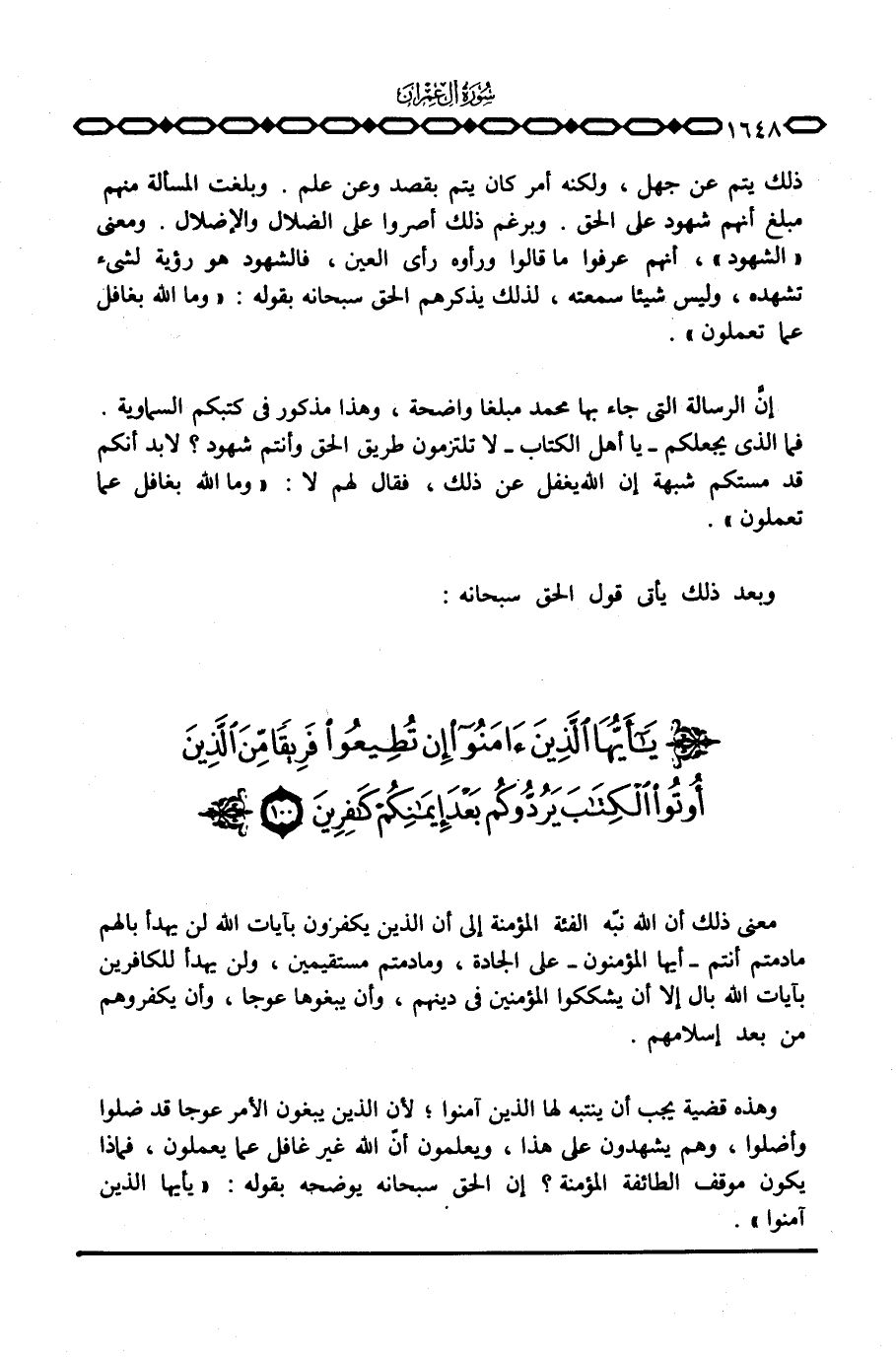 إنَّ الرسالة التي جاء بها محمد مبلغا واضحة، وهذا مذكور في كتبكم السماوية. فما الذي يجعلكم - يا أهل الكتاب - لا تلتزمون طريق الحق وأنتم شهود؟ لا بد أنكم قد مستكم شبهة إن الله يغفل عن ذلك، فقال لهم لا: {وَمَا الله بِغَافِلٍ عَمَّا تَعْمَلُونَ} .