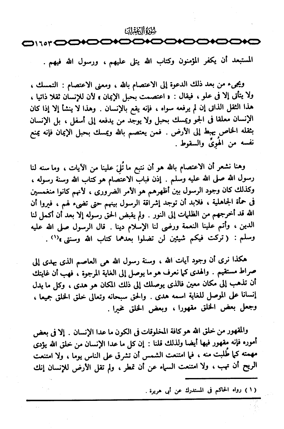 وهنا نشعر أن الاعتصام بالله هو أن نتبع ما تُلِيَ علينا من الآيات، وما سنه لنا رسول الله صَلَّى اللَّهُ عَلَيْهِ وَسَلَّم َ. إذن فباب الاعتصام هو كتاب الله وسنة رسوله، وكذلك كان وجود الرسول بين أظهرهم هو الأمر الضروري، لأنهم كانوا منغمسين في حمأة الجاهلية، فلا بد أن توجد إشراقة الرسول بينهم حتى تضيء لهم، فيروا أن الله قد أخرجهم من الظلمات إلى النور. ولم يقبض الحق رسوله إلا بعد أن أكمل لنا الدين، وأتم علينا النعمة ورضي لنا الإسلام دينا. قال الرسول صَلَّى اللَّهُ عَلَيْهِ وَسَلَّم َ: «تركت فيكم شيئين لن تضلوا بعدهما كتاب الله وسنتي» .