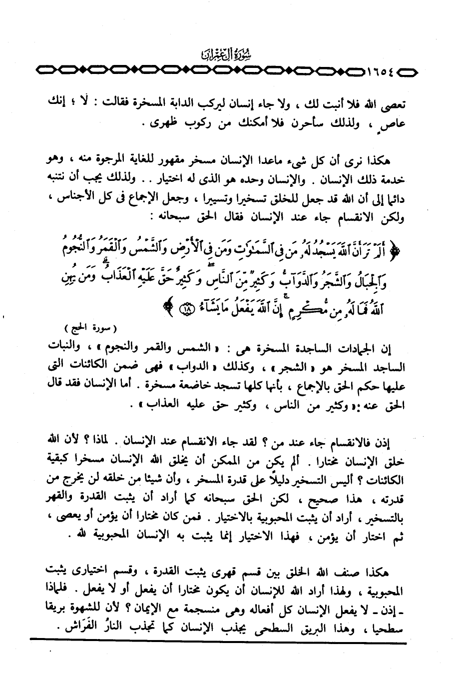 هكذا نرى أن كل شيء ما عدا الإنسان مسخر مقهور للغاية المرجوة منه، وهو خدمة ذلك الإنسان. والإنسان وحده هو الذي له اختيار. . ولذلك يجب أن نتنبه دائما إلى أن الله قد جعل للخلق تسخيرا وتسييرا، وجعل الإجماع في كل الأجناس، ولكن الانقسام جاء عند الإنسان فقال الحق سبحانه: {أَلَمْ تَرَ أَنَّ الله يَسْجُدُ لَهُ مَن فِي السماوات وَمَن فِي الأرض والشمس والقمر والنجوم والجبال والشجر والدوآب وَكَثِيرٌ مِّنَ الناس وَكَثِيرٌ حَقَّ عَلَيْهِ العذاب وَمَن يُهِنِ الله فَمَا لَهُ مِن مُّكْرِمٍ إِنَّ الله يَفْعَلُ مَا يَشَآءُ} [الحج: 18]