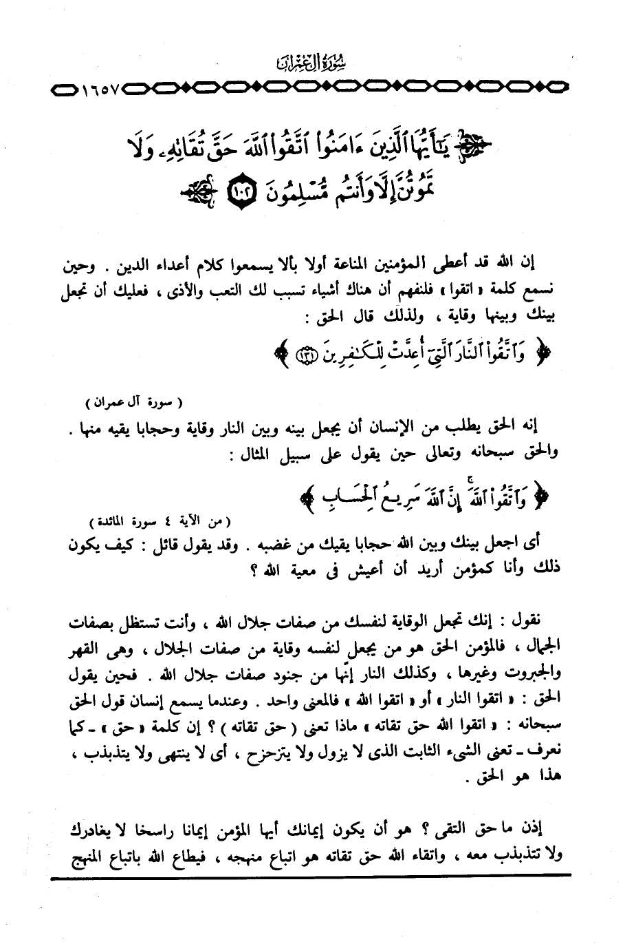 نقول: إنك تجعل الوقاية لنفسك من صفات جلال الله، وأنت تستظل بصفات الجمال، فالمؤمن الحق هو من يجعل لنفسه وقاية من صفات جلال الله، وهي القهر والجبروت وغيرها، وكذلك النار إنّها من جنود صفات الجلال. فحين يقول الحق: {اتقوا النار} أو {اتقوا الله} فالمعنى واحد. وعندما يسمع إنسان قول الحق سبحانه: {اتقوا الله حَقَّ تُقَاتِهِ} ماذا تعني (حق تقاته) ؟ إن كلمة «حق» - كما نعرف - تعني الشيء الثابت الذي لا يزول ولا يتزحزح، أي لا ينتهي ولا يتذبذب، هذا هو الحق.