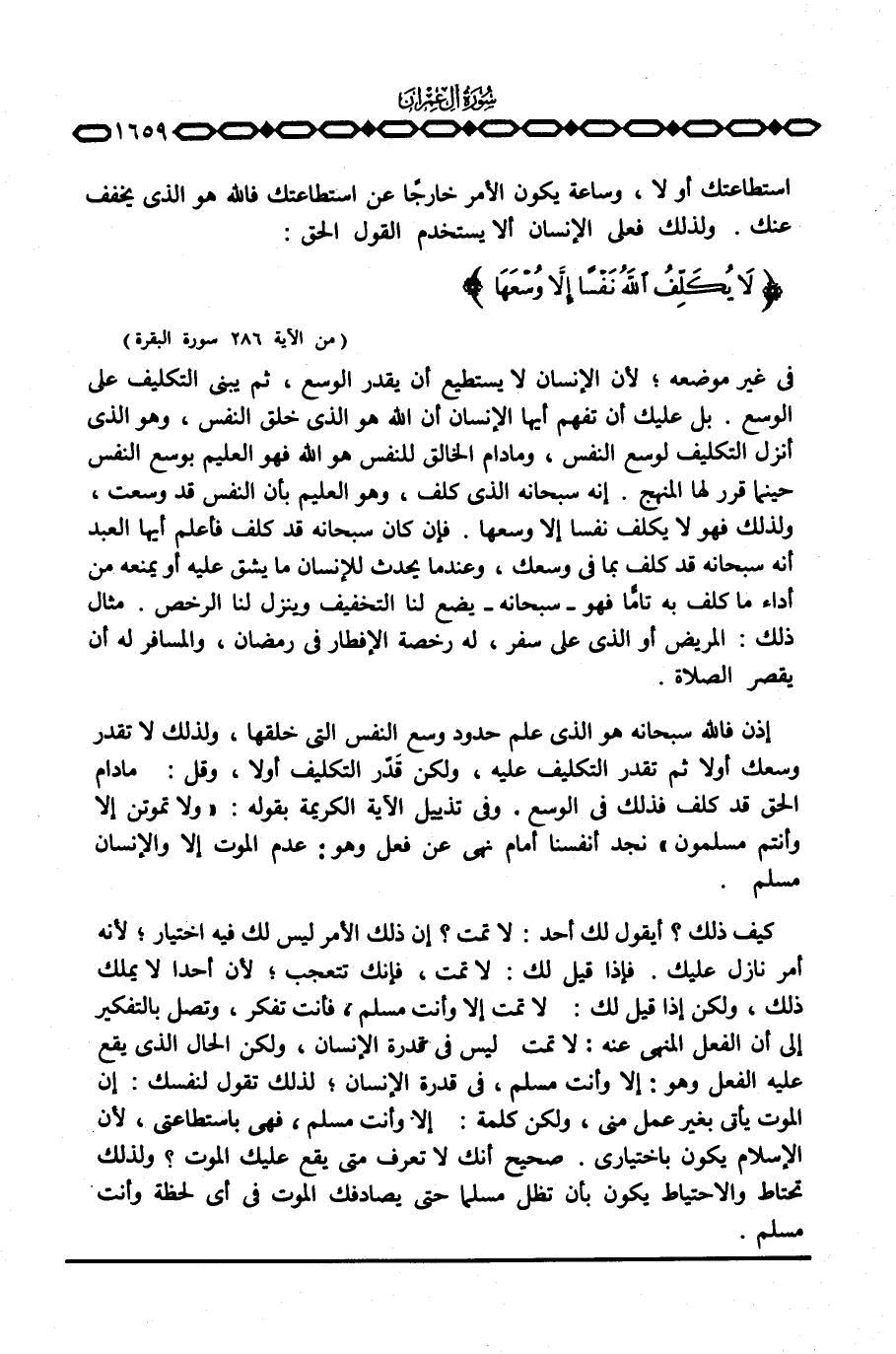 في غير موضعه؛ لأن الإنسان لا يستطيع أن يقدر الوسع، ثم يبني التكليف على الوسع. بل عليك أن تفهم أيها الإنسان أن الله هو الذي خلق النفس، وهو الذي أنزل التكليف لوسع النفس، وما دام الخالق للنفس هو الله فهو العليم بوسع النفس حينما قرر لها المنهج. إنه سبحانه الذي كلف، وهو العليم بأن النفس قد وسعت، ولذلك فهو لا يكلف نفسا إلا وسعها. فإن كان سبحانه قد كلف فأعلم أيها العبد أنه سبحانه قد كلف بما في وسعك، وعندما يحدث للإنسان ما يشق عليه أو يمنعه من أداء ما كلف به تامّاً فهو - سبحانه - يضع لنا التخفيف وينزل لنا الرخص. مثال ذلك: المريض أو الذي على سفر، له رخصة الإفطار في رمضان، والمسافر له أن يقصر الصلاة.