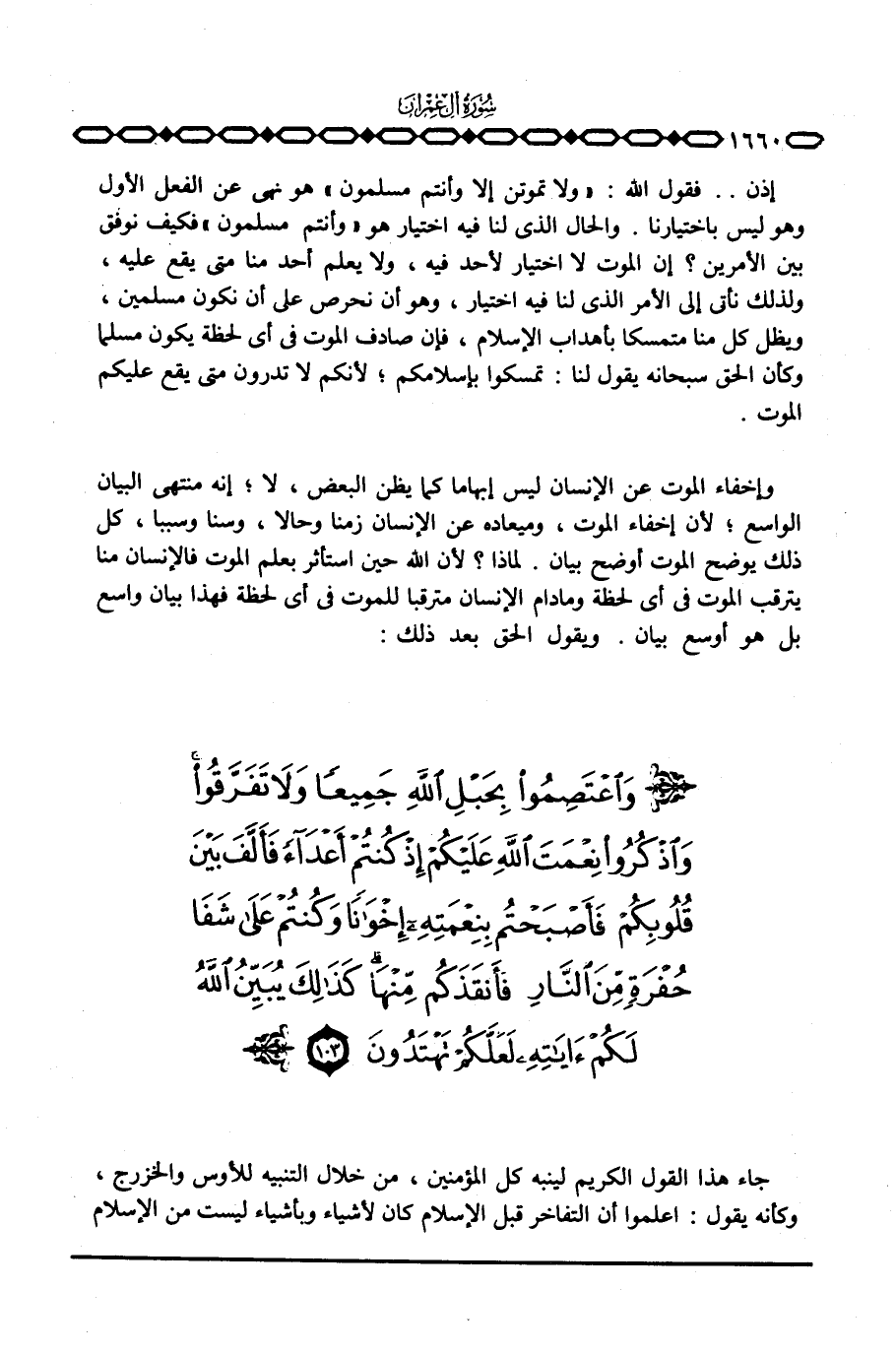 وإخفاء الموت عن الإنسان ليس إبهاما كما يظن البعض، لا؛ إنه منتهي البيان الواسع؛ لأن إخفاء الموت، وميعاده عن الإنسان زمنا وحالا، وسنا وسببا، كل ذلك يوضح الموت أوضح بيان. لماذا؟ لأن الله حين استأثر بعلم الموت فالإنسان منا يترقب الموت في أي لحظة وما دام الإنسان مترقبا للموت في أي لحظة فهذا بيان واسع بل هو أوسع بيان. ويقول الحق بعد ذلك: {واعتصموا بِحَبْلِ الله جَمِيعاً وَلاَ تَفَرَّقُواْ واذكروا نِعْمَتَ الله عَلَيْكُمْ إِذْ كُنْتُمْ أَعْدَآءً فَأَلَّفَ بَيْنَ قُلُوبِكُمْ ... }