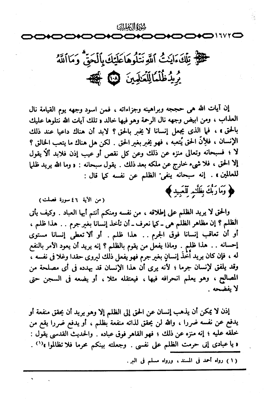 إذن لا يمكن أن يذهب إنسان عن الحق إلى الظلم إلا وهو يريد أن يحقق منفعة أو يدفع عن نفسه ضررا، والله لن يحقق لذاته منفعة بظلم، أو يدفع ضررا يقع من خلقه عليه؛ إنه منزه عن ذلك؛ فهو القاهر فوق عباده. والحديث القدسي يقول: «يا عبادي إني حرمت الظلم على نفسي. وجعلته بينكم محرما فلا تظالموا» .