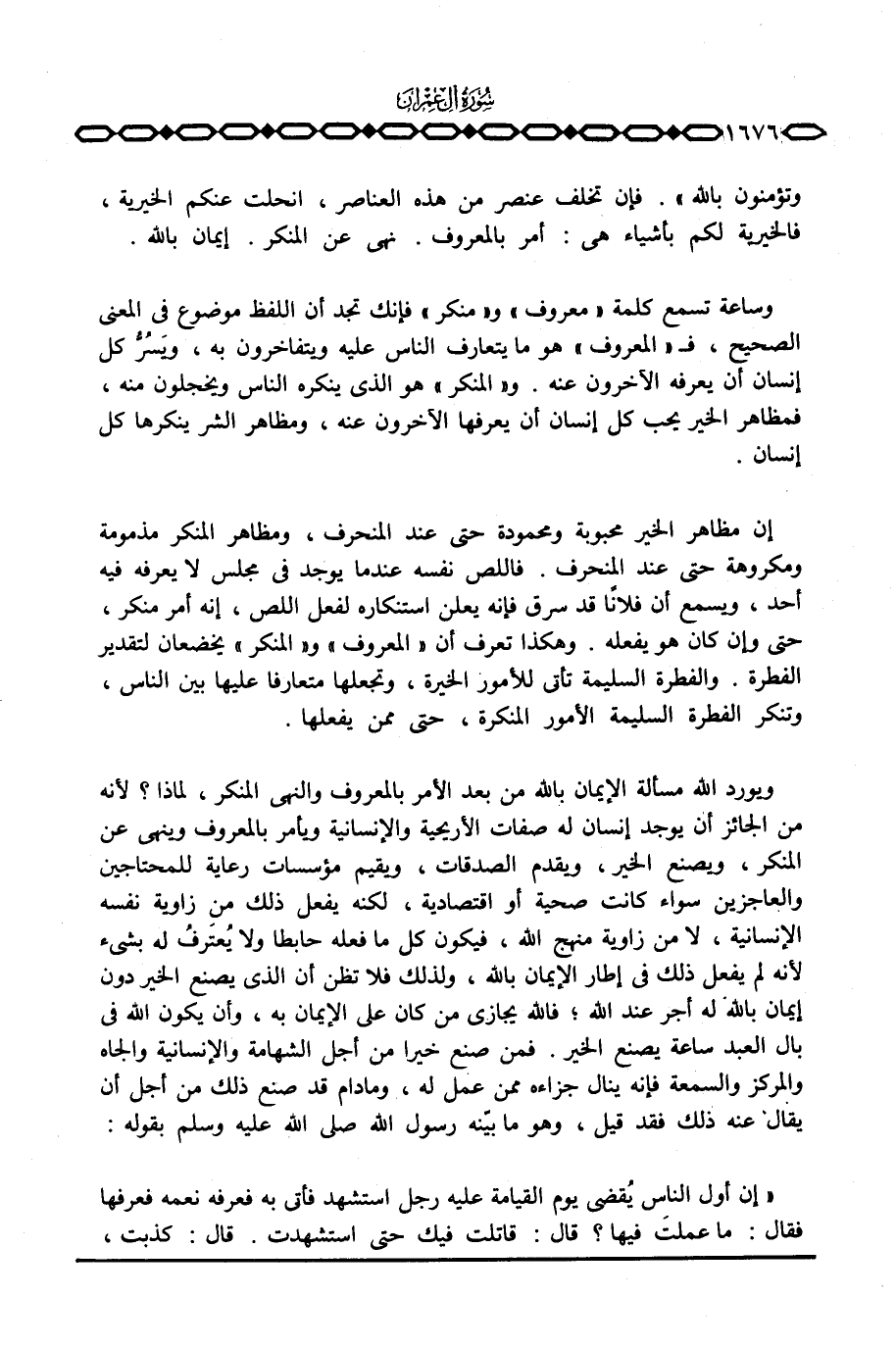 ويورد الله مسألة الإيمان بالله من بعد الأمر بالمعروف والنهي عن المنكر، لماذا؟ لأنه من الجائزة أن يوجد إنسان له صفات الأريحية والإنسانية ويأمر بالمعروف وينهي عن المنكر، ويصنع الخير، ويقدم الصدقات، ويقيم مؤسسات رعاية للمحتاجين والعاجزين سواء كانت صحية أو اقتصادية، لكنه يفعل ذلك من زاوية نفسه الإنسانية، لا من زاوية منهج الله، فيكون كل ما يفعله حابطا ولا يُعتَرفُ له بشيء لأنه لم يفعل ذلك في إطار الإيمان بالله، ولذلك فلا تظن أن الذي يصنع الخير دون إيمان بالله؛ فالله يجازي من كان على الإيمان به، وأن يكون الله في بال العبد ساعة يصنع الخير. فمن صنع خيرا من أجل الشهامة والإنسانية والجاه والمركز والسمعة فإنه ينال جزاءه ممن عمل له، ومادام قد صنع ذلك من أجل أن يقال عنه ذلك فقد قيل، وهو ما يبيّنه رسول الله صَلَّى اللَّهُ عَلَيْهِ وَسَلَّم َ بقوله: «إن أول الناس يُقضي يوم القيامة عليه رجل استشهد فأتي به فعرفه نعمه فعرفها فقال: ما عملتَ فيها؟ قال: قاتلت فيك حتى استشهدت. قال: كذبت،